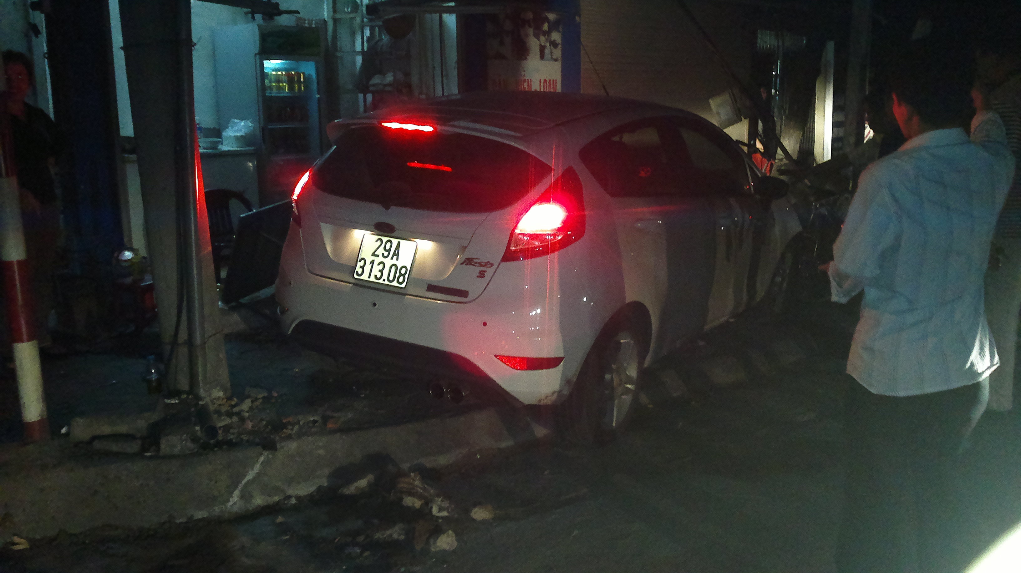 Vụ tai nạn xảy ra lúc 0h30 ngày 5/11, khi chiếc xe Ford đang lưu thông bất ngờ mất lái lao nhanh lên vỉa hè trước số nhà 104 A1 Giảng Võ (Đống Đa, Hà Nội) đâm đổ 1 trạm điện cao áp và cột biển báo giao thông, làm bị thương 3 người (2 nữ và 1 nam) trong đó có 1 cô gái phải nhập viện ngay lập tức, làm hư hại 1 xe đạp và 2 xe máy.