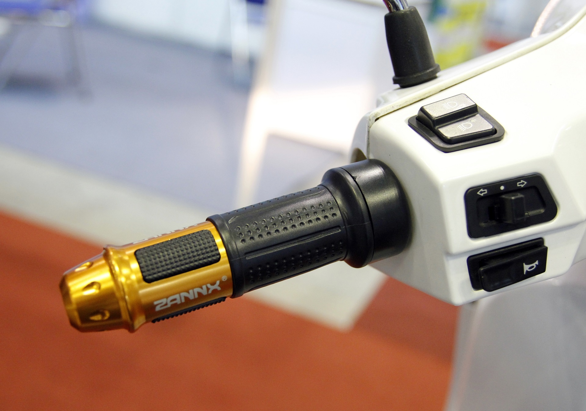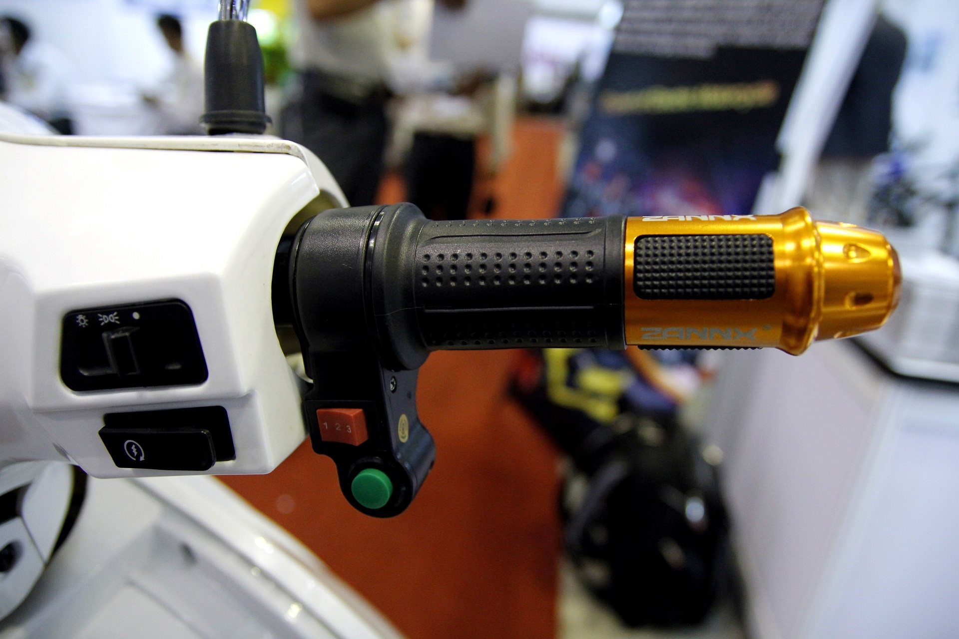 | Phía tay phải là tay ga, công tắc màu đỏ là nút chuyển số. Bạn có thể chạy tốc độ chậm khi bấm số 1, tốc độ cao nhất khi ở số 3. Nút màu xanh là nút cố định vận tốc, chẳng hạn trên đoạn đường thẳng, bạn không muốn tăng, giảm tốc, làm ảnh hưởng tới lượng điện trong bình có thể nhấn nút xanh, và từ đó trở đi xe của bạn sẽ giữ nguyên vận tốc. |