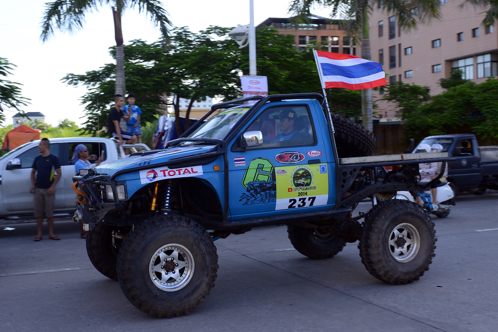 Sự xuất hiện của chiếc ô tô khủng màu hồng cùng hai tay lái nữ Thái Lan trong đoàn diễu hành trước giải đua ô tô off-road RFC tại Hạ Long thu hút mọi ánh nhìn của người đi đường.