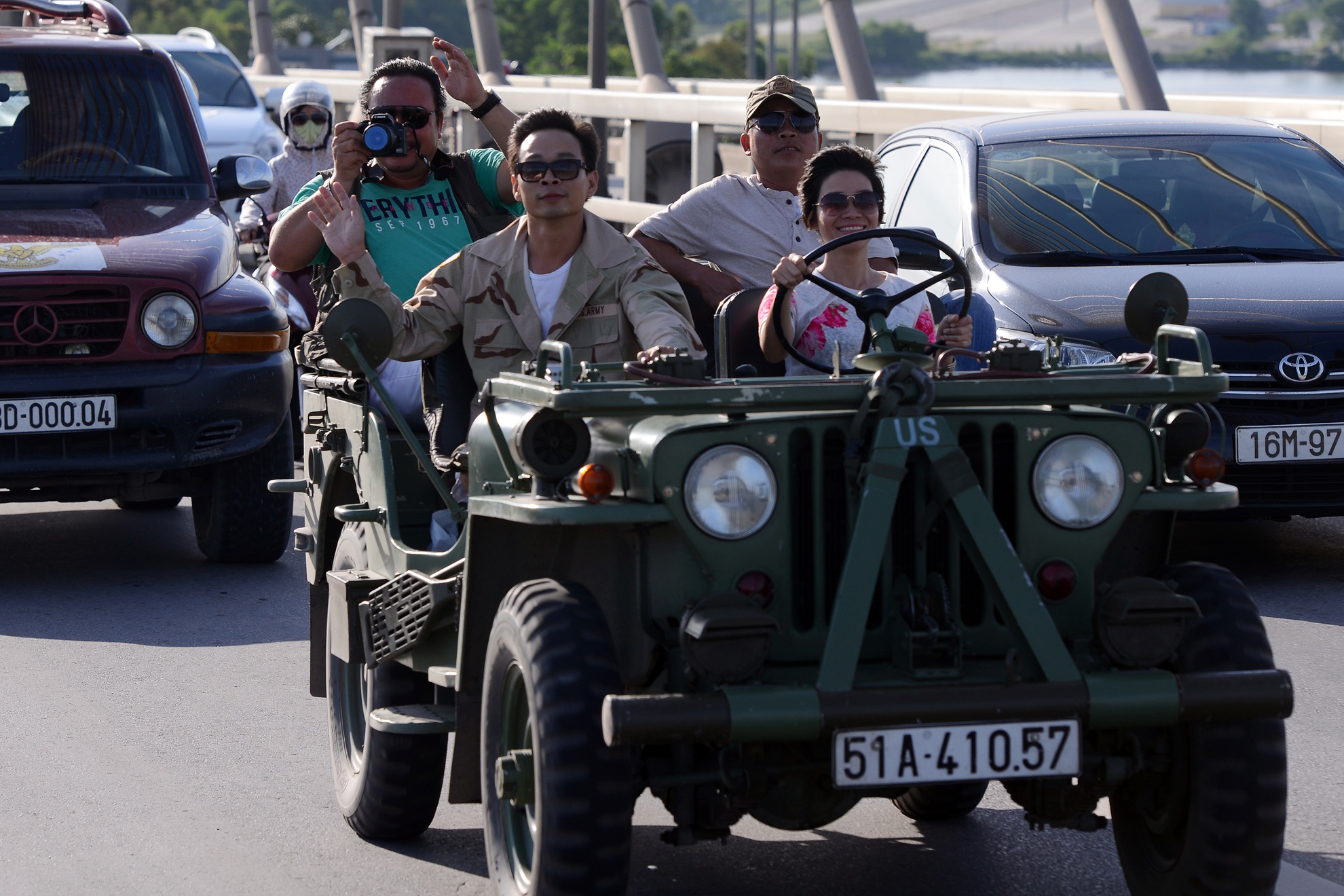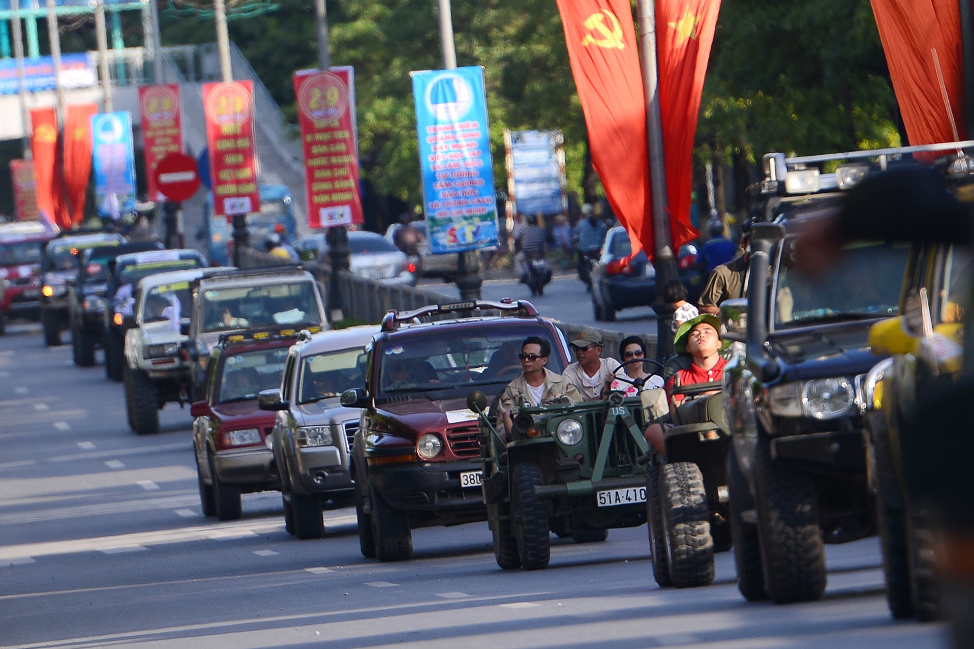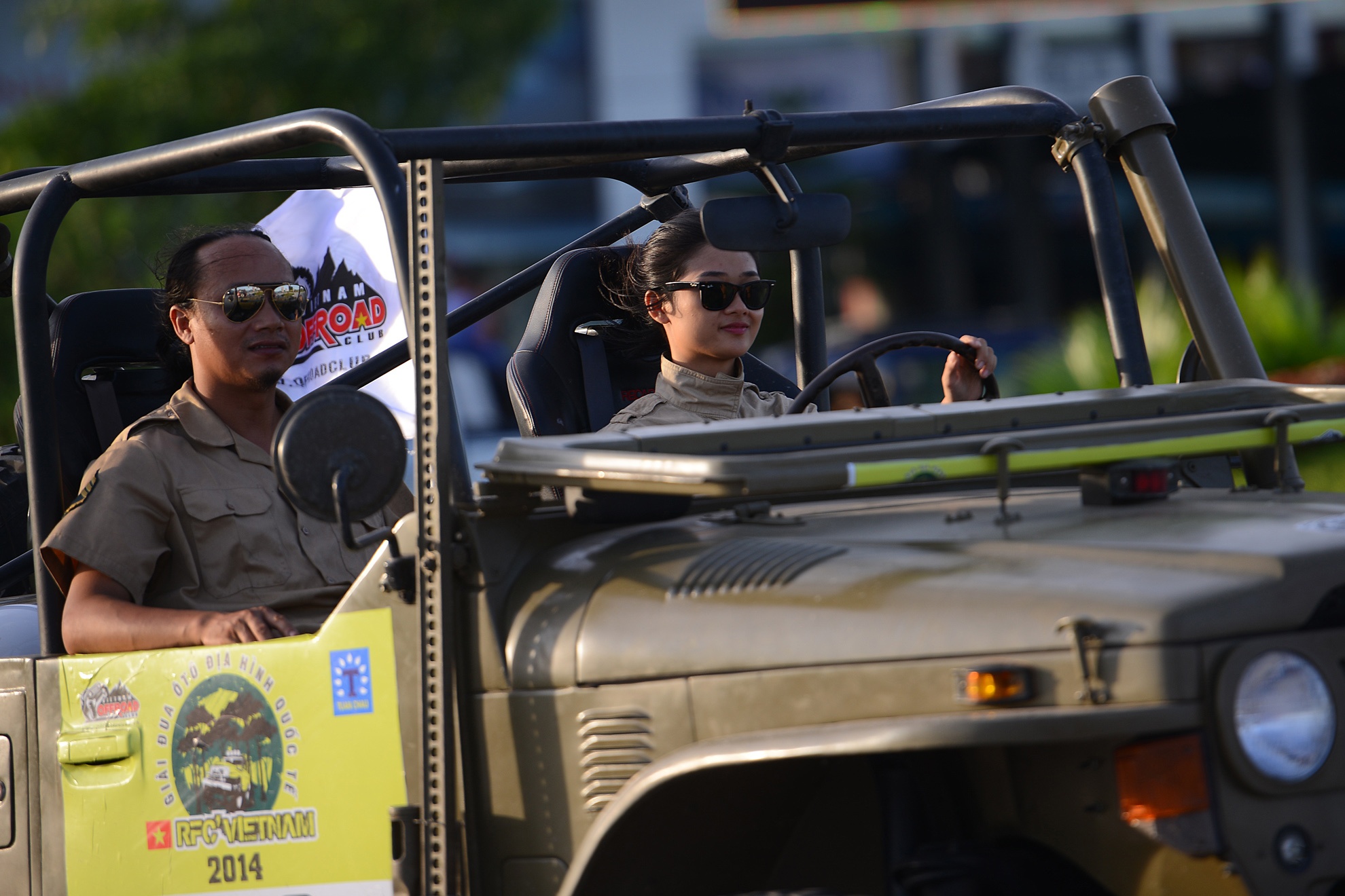 | Đoàn diễu hành cũng xuất hiện không ít tay lái là nữ xinh đẹp và cá tính trên những chiếc xe Jeep mui trần. |