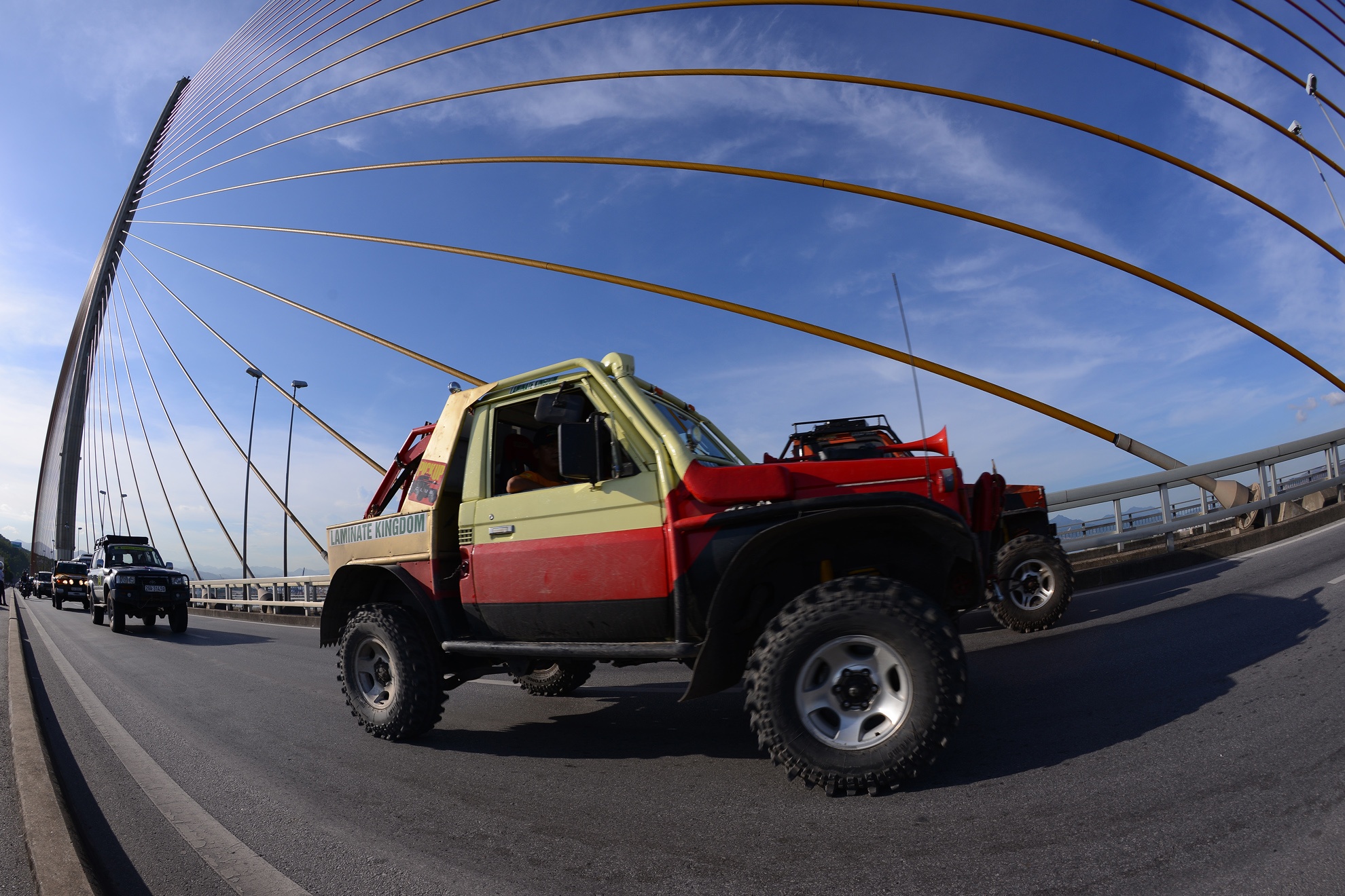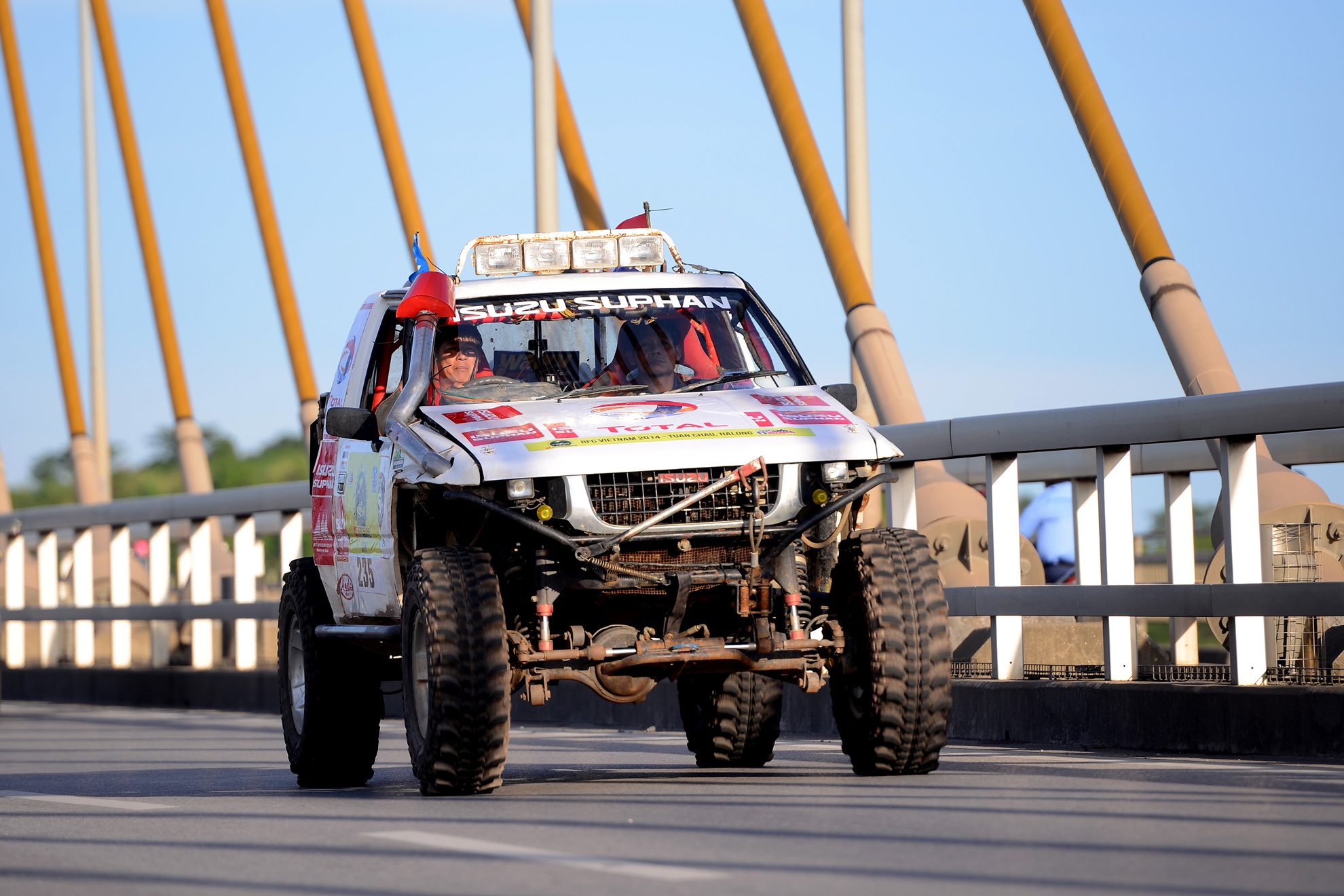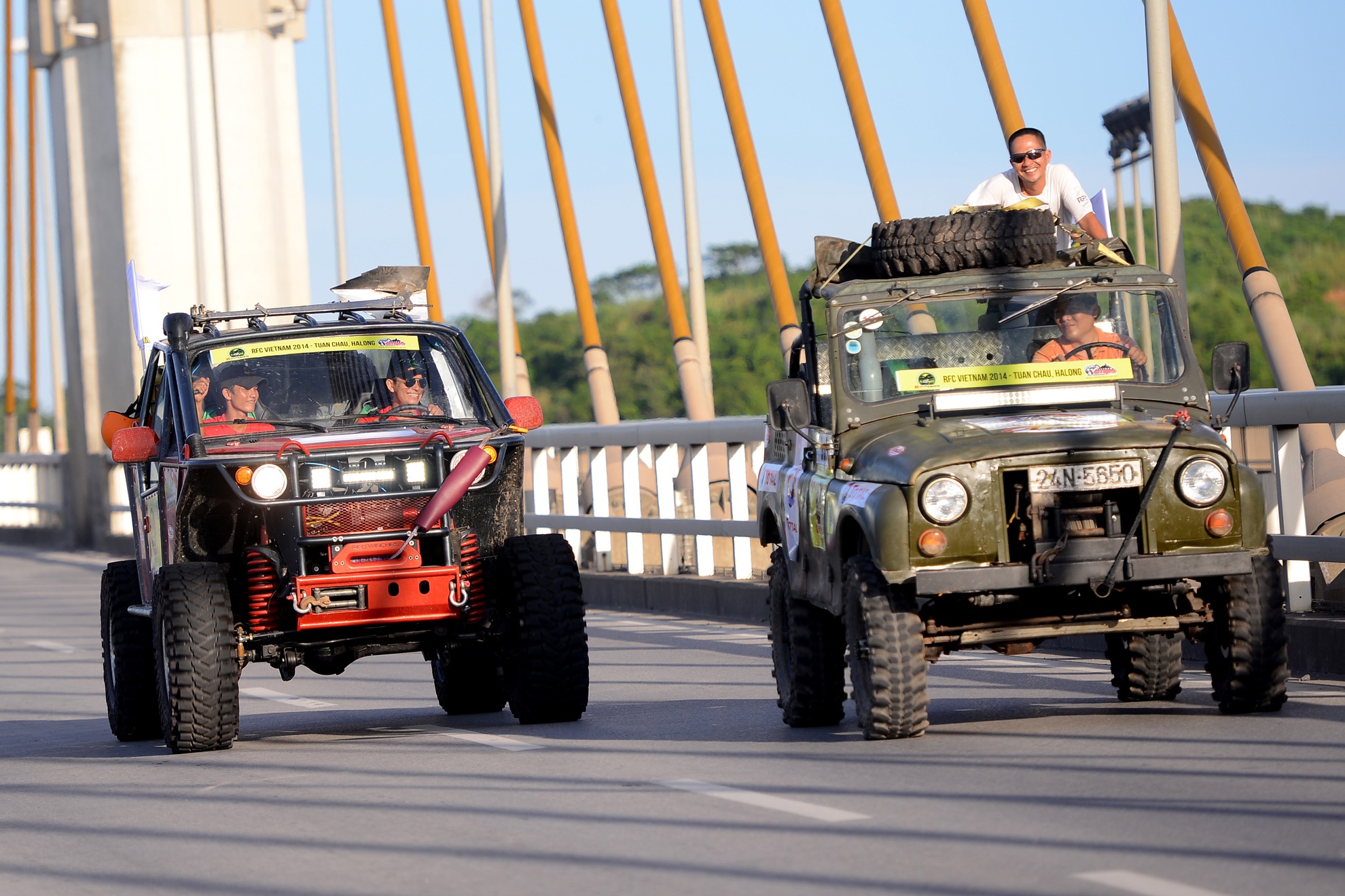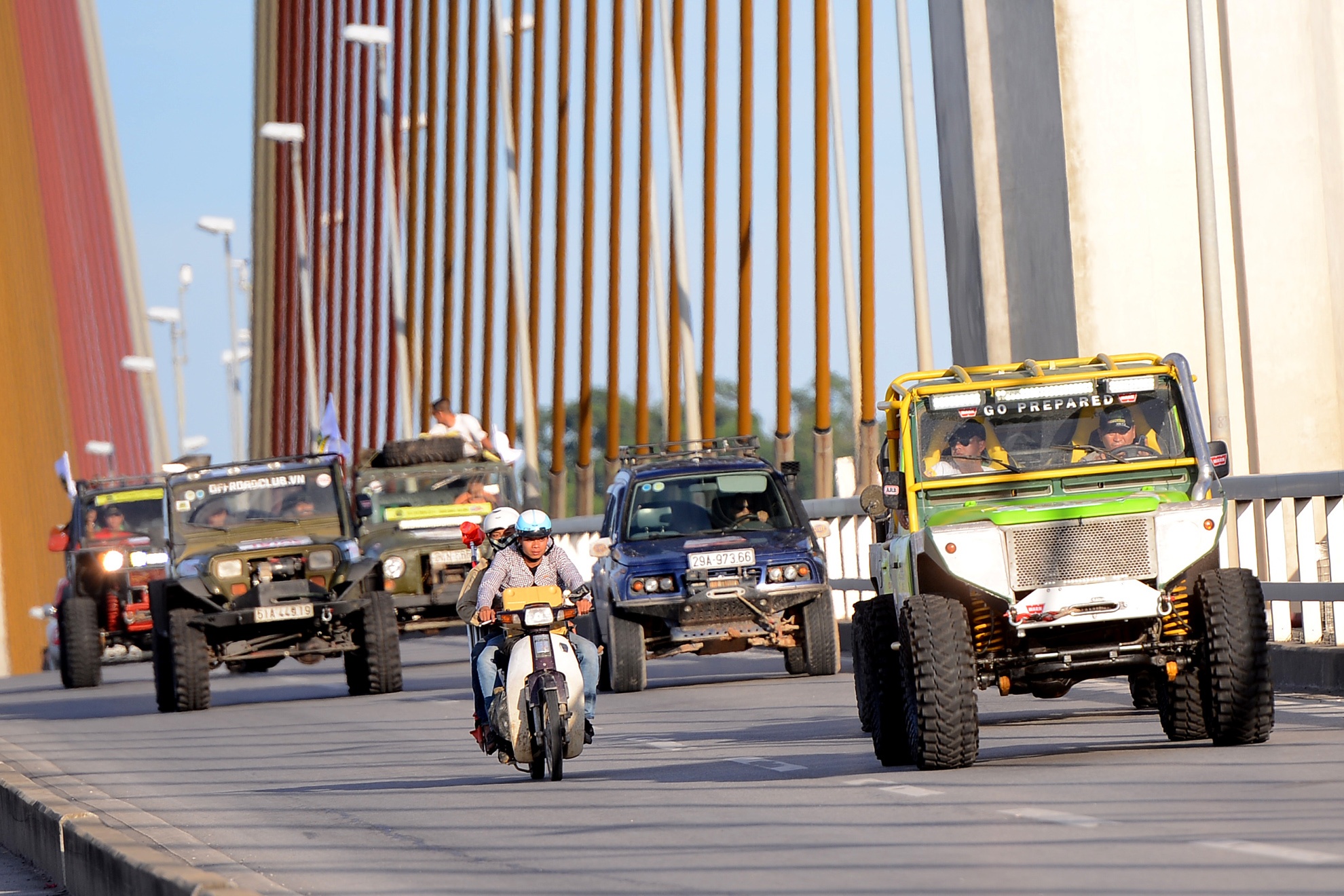 | Hình ảnh đoàn diễu hành chạy xe qua cầu Bãi Cháy, cây cầu dây văng một mặt phẳng dây lớn nhất Việt Nam nối liền Bãi Cháy và Hòn Gai (thành phố Hạ Long). |
