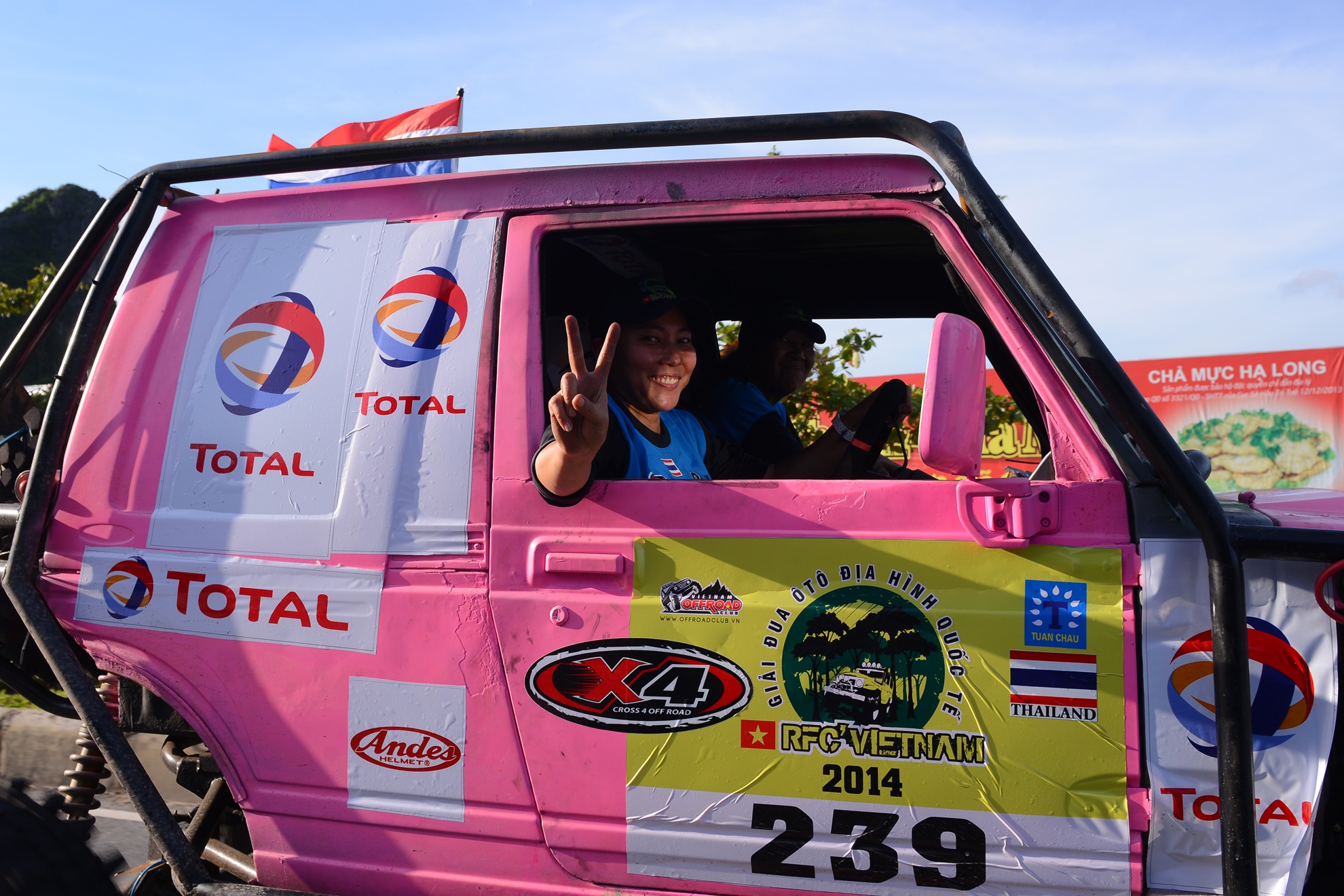 | Nổi bật và ấn tượng nhất đoàn diễu hành qua Bãi Cháy và thành phố Hạ Long chiều 24/8 là một chiếc xe ô tô độ khủng màu hồng mang số báo danh 239 treo cờ Thái Lan. |