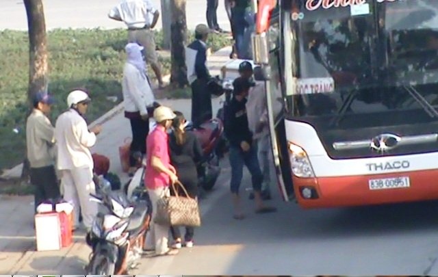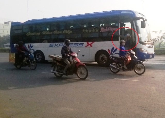 | Xe khách dừng đậu trên đường để phụ xe xuống đường bắt khách. |