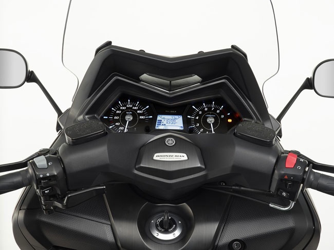 Bên trên cụm đèn pha là viền bằng nhôm mới nhằm tăng thiết kế độc đáo và đúng chất phiên bản đặc biệt cho Yamaha TMAX Bronze MAX 2014. Cuối cùng là viền gỗ sang trọng bao xung quanh cụm đồng hồ và bảng điều khiển.