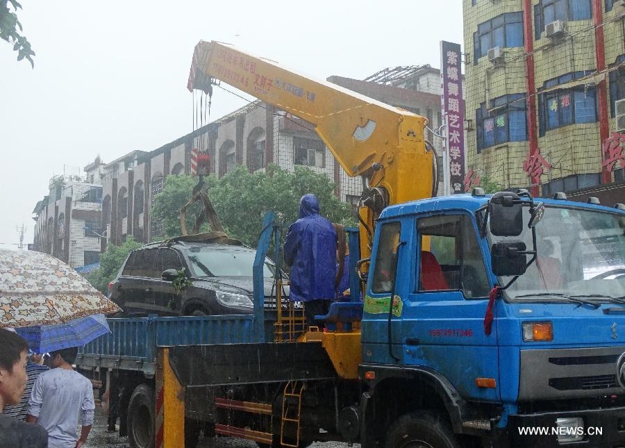 | Cần cẩu giải cứu một xe hơi chìm trong nước lũ tại huyện Thiệu Đông hôm 25/5. |
