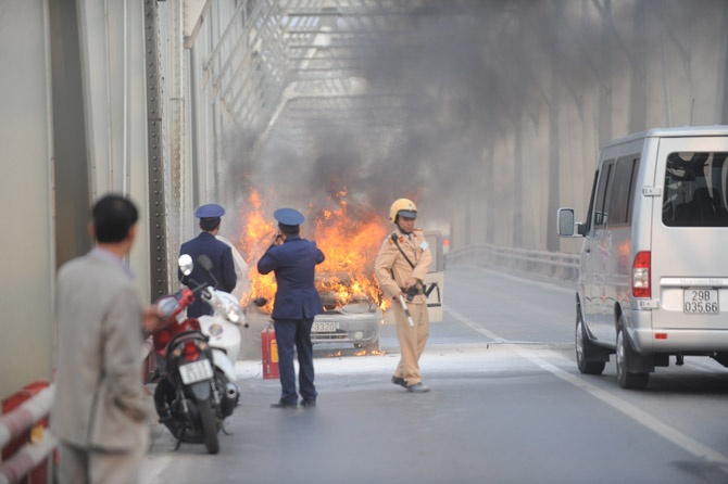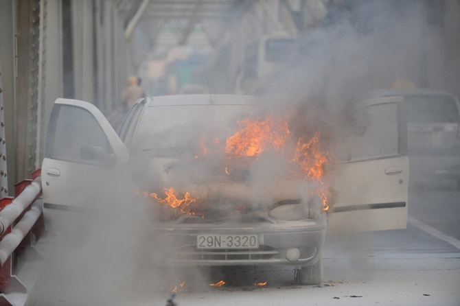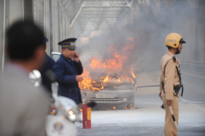 | Chủ chiếc xe này cho hay khi đang lái thì nghe có tiếng lộp bộp trong xe, nghi ngờ có vấn đề, tài xế dừng xe và thoát ra ngoài. Lực lượng cảnh sát được huy động kịp thờ để dập lửa. |