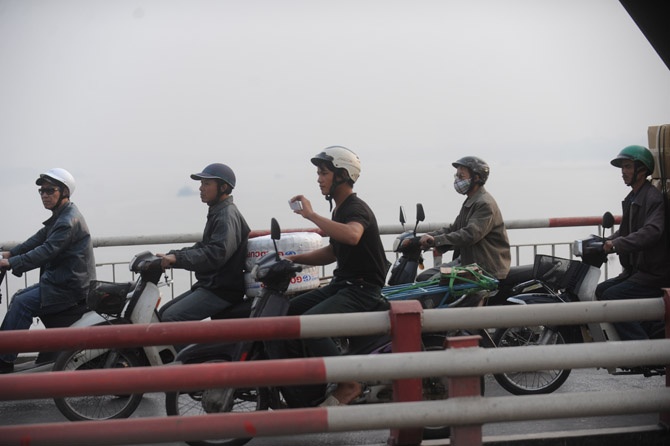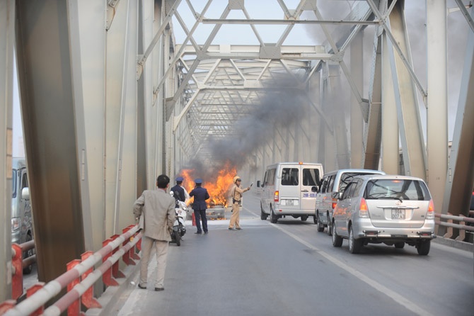 | Người đi đường hiếu kì dừng lại quan sát làm cho giao thông trên cầu Chương Dương ùn tắc cục bộ. |