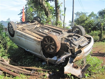 Rạng sáng 3/9, ô tô 4 chỗ lưu thông trên quốc lộ 14, hướng TP Pleiku - Kon Tum. Đến thôn 3, xã Hòa Phú, Chư Pah, Gia Lai, xe phóng vào lề đường, tông phải gốc tiêu, lật ngửa.