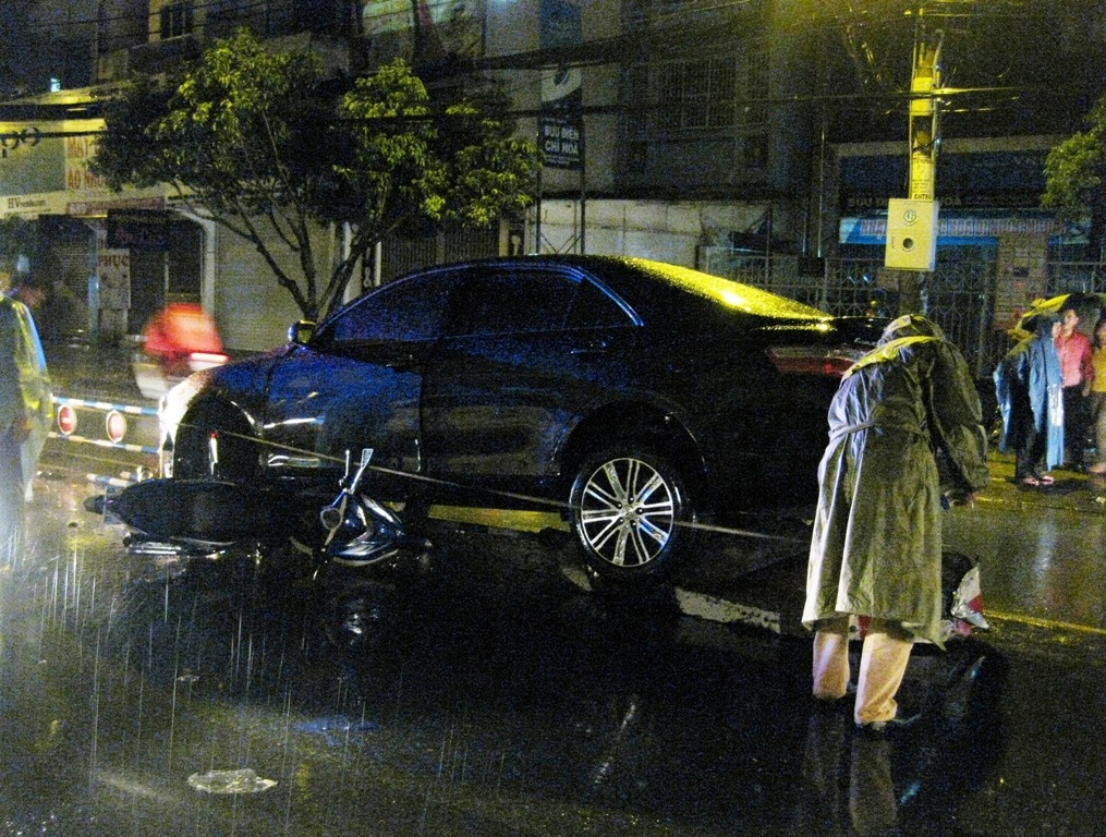 Trong lúc đang ủi dải phân cách, xe ô tô lấn qua phần đường ngược lại và tông vào một xe máy hiệu Exciter. Hàng chục xe máy chạy phía sau xe Exciter bị một phen hoảng loạn, nháo nhào tránh né “hung thần”.