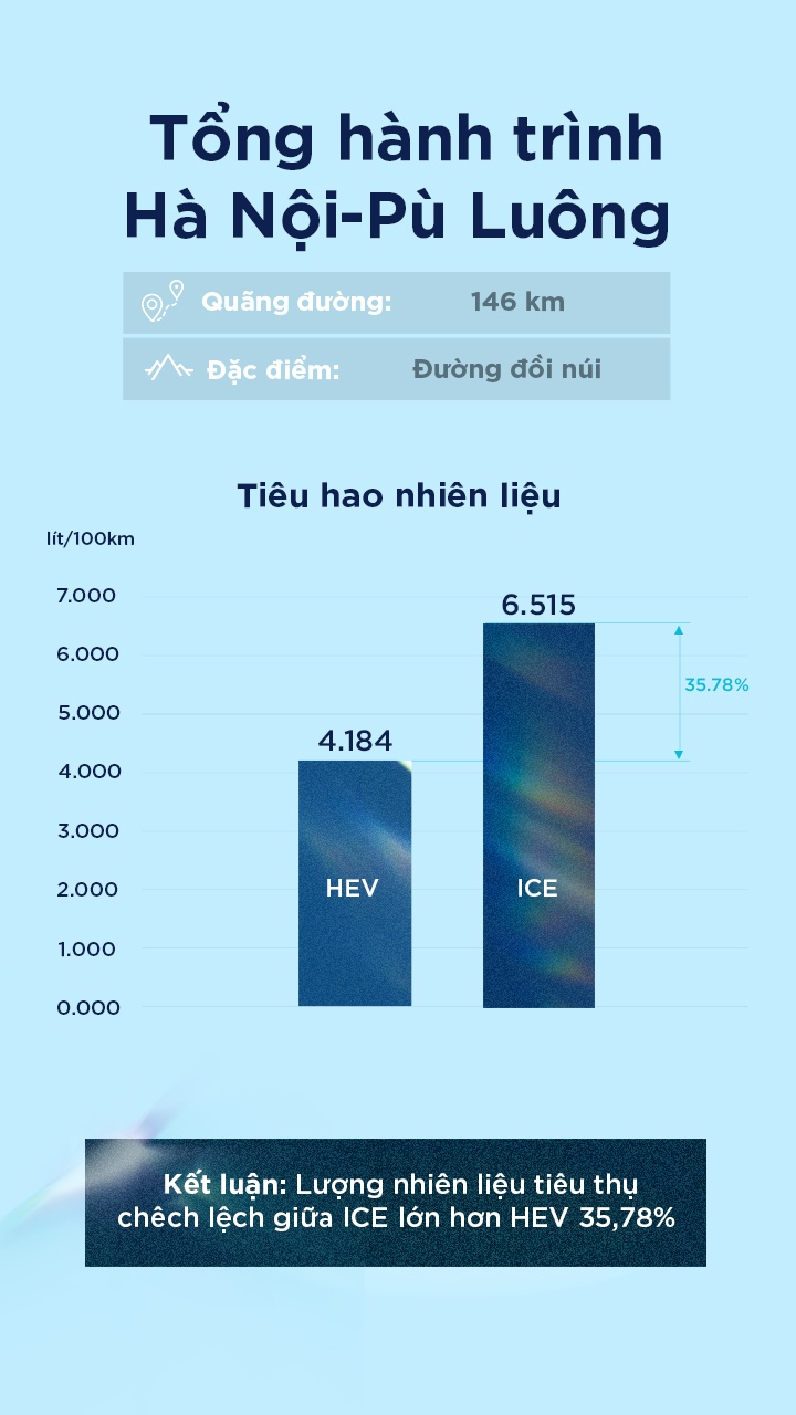 Trong đô thị, Corolla Cross bản hybrid tiết kiệm khoảng 32% lượng xăng so với bản ICE. Theo lý giải của nhóm, xe phanh nhiều trong đô thị nên hệ thống tái tạo năng lượng sạc được đáng kể cho pin. Ở hành trình Hà Nội - Pù Luông có đủ cả đường cao tốc, lên dốc, xuống dốc và đường đèo, mẫu xe hybrid của Toyota tiết kiệm đến 35,7% lượng nhiên liệu so với động cơ ICE.