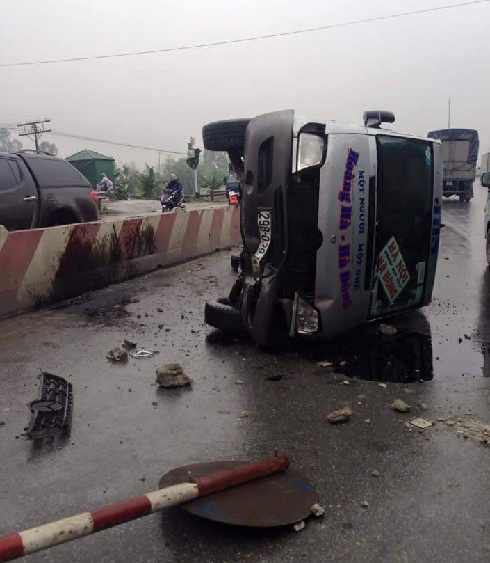 | Ôtô lật giữa đường, dầu máy chảy lênh láng. |