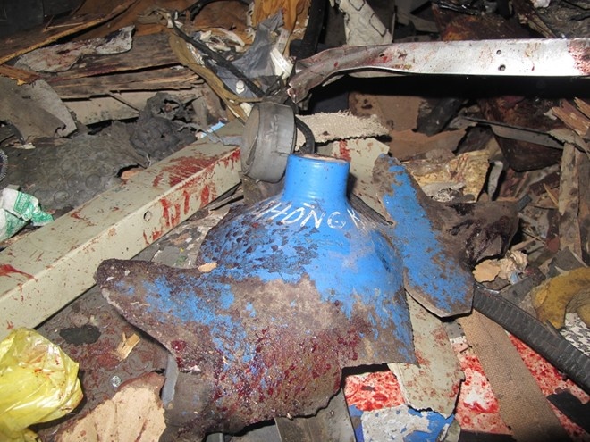 | Một phần của vỏ bình ô xy còn sót lại sau vụ nổ. |