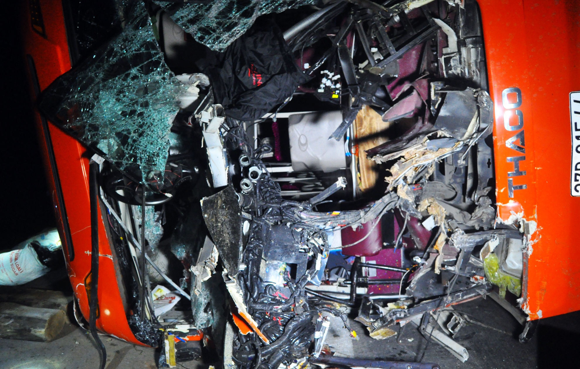 | Phần đầu ôtô khách biến dạng sau va chạm. |