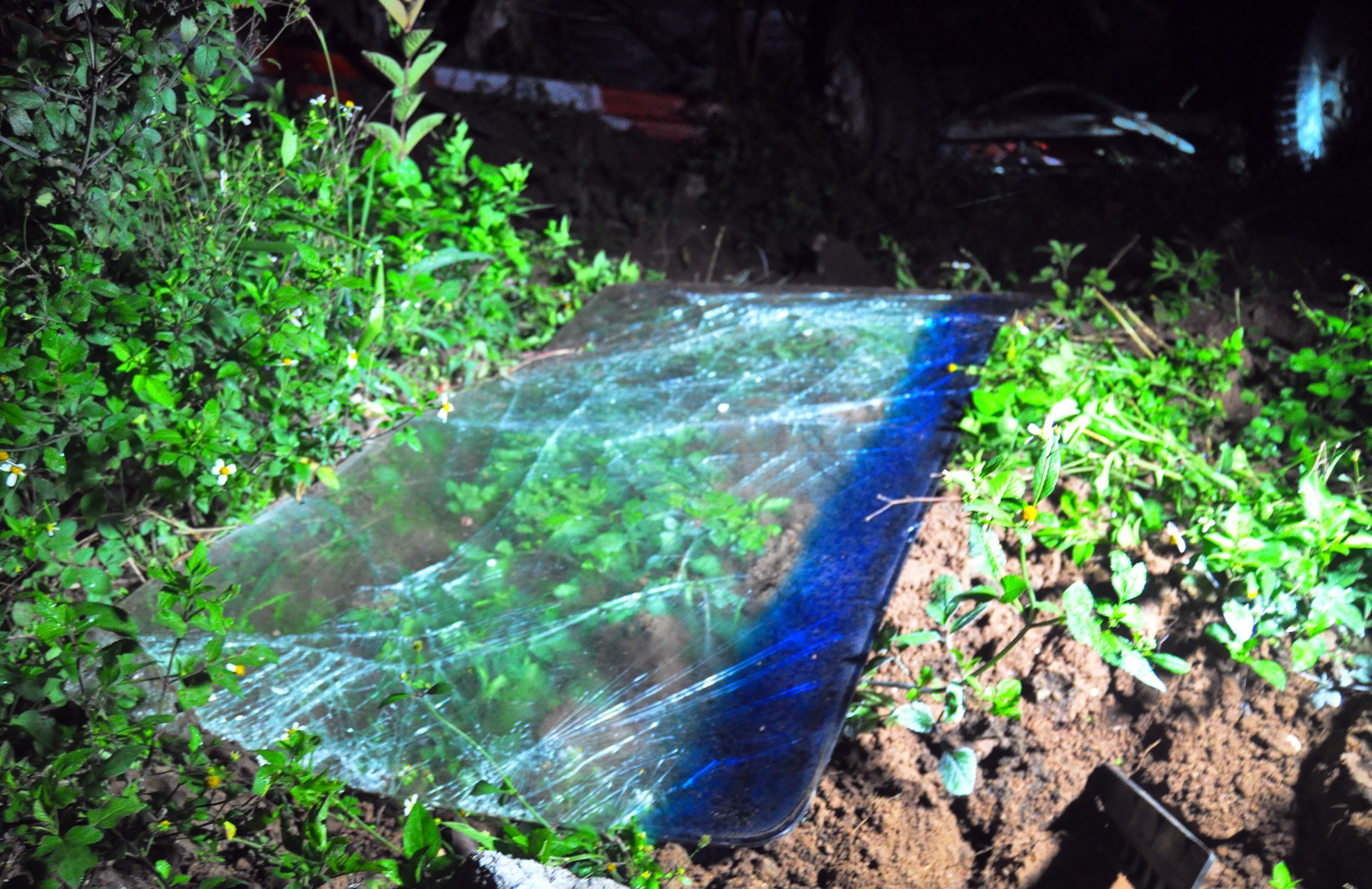 | Kính trước của xe rơi dưới vệ cao tốc. Theo ghi nhận, vị trí gặp sự cố trên cao tốc không có đèn cao áp nên công tác cứu hộ gặp nhiều khó khăn. |