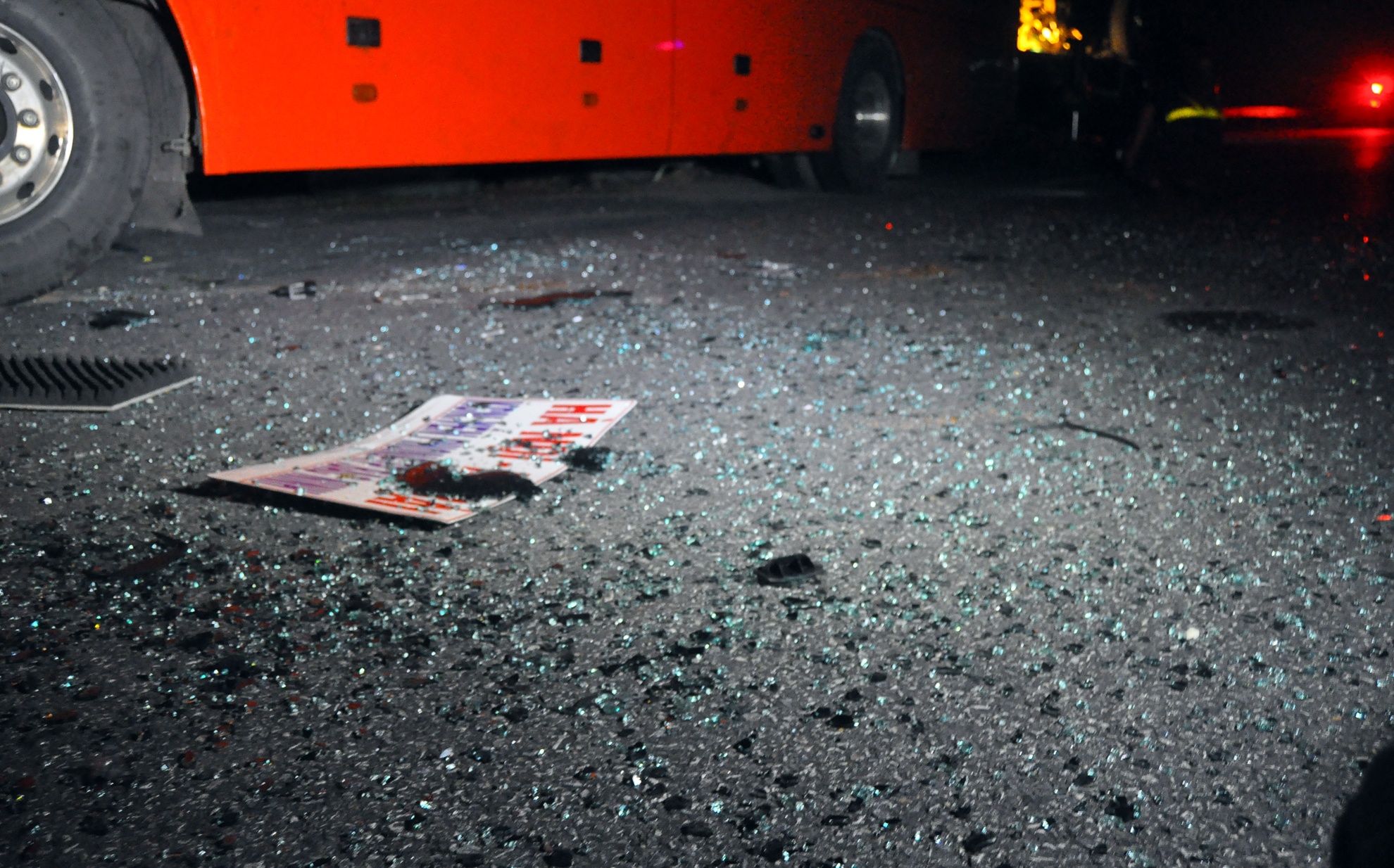 | Kính vỡ vụn dưới lòng đường. 3h ngày 8/12, lực lượng cứu hộ đã đưa chiếc xe khách rời khỏi hiện trường. Cơ quan chức năng vẫn tiếp tục giải cứu xe tải. |
