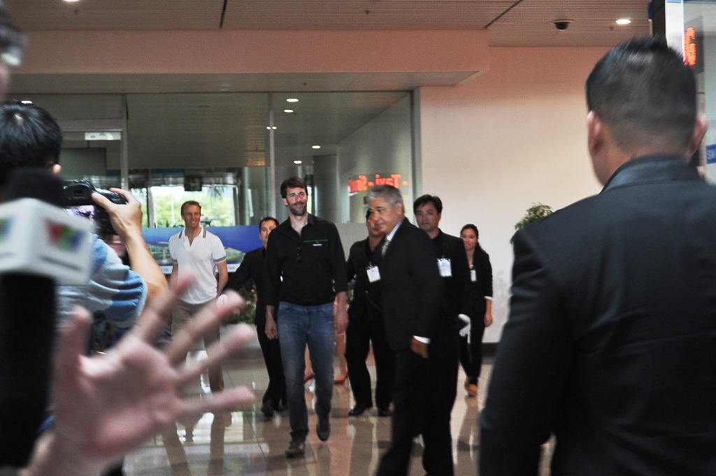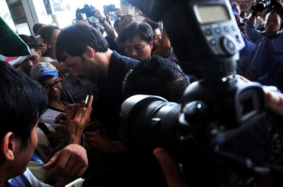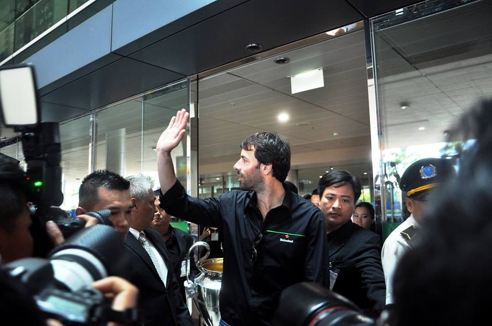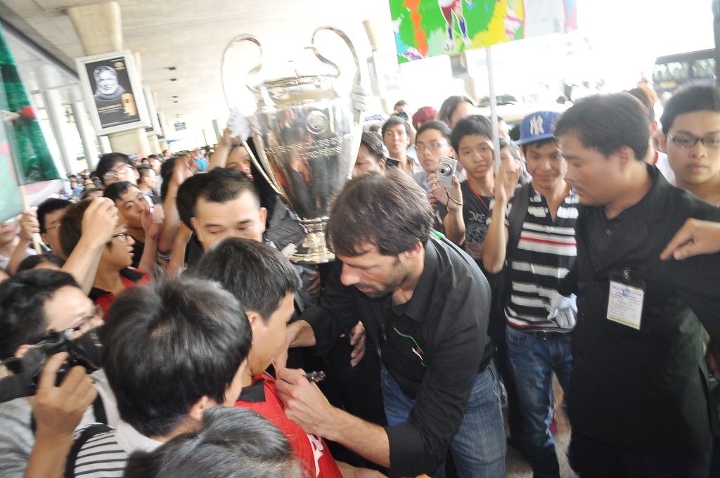 | Các vệ sĩ vất vả hộ tống anh cùng chiếc Cup Champions League trước sự cuồng nhiệt của người hâm mộ Việt Nam. |