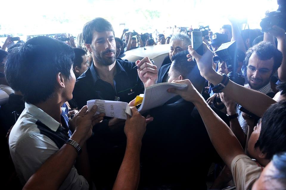 Đông đảo người hâm mộ vây quanh Van Nistelrooy khi anh tiến ra xe. Sức hút của cựu danh thủ năm nay 37 tuổi vẫn rất lớn.