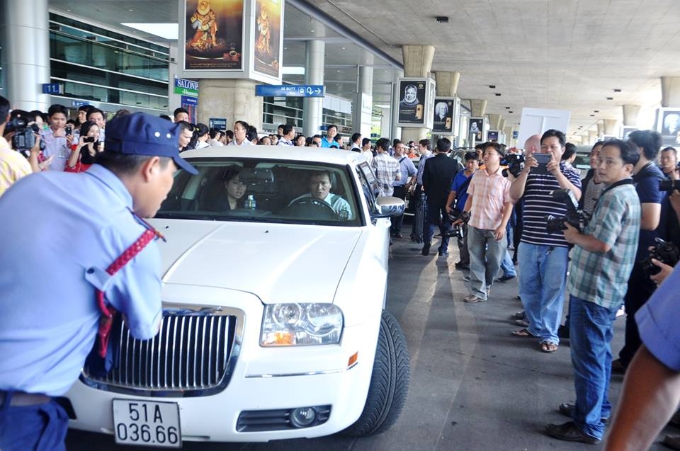 Cựu tiền đạo M.U và Real Madrid được chiếc limousine Chrysler màu trắng hộ tống ngay sau khi đặt chân xuống TP.HCM. Đây cũng là xe sang đưa đón anh trong những sự kiện tiếp theo.