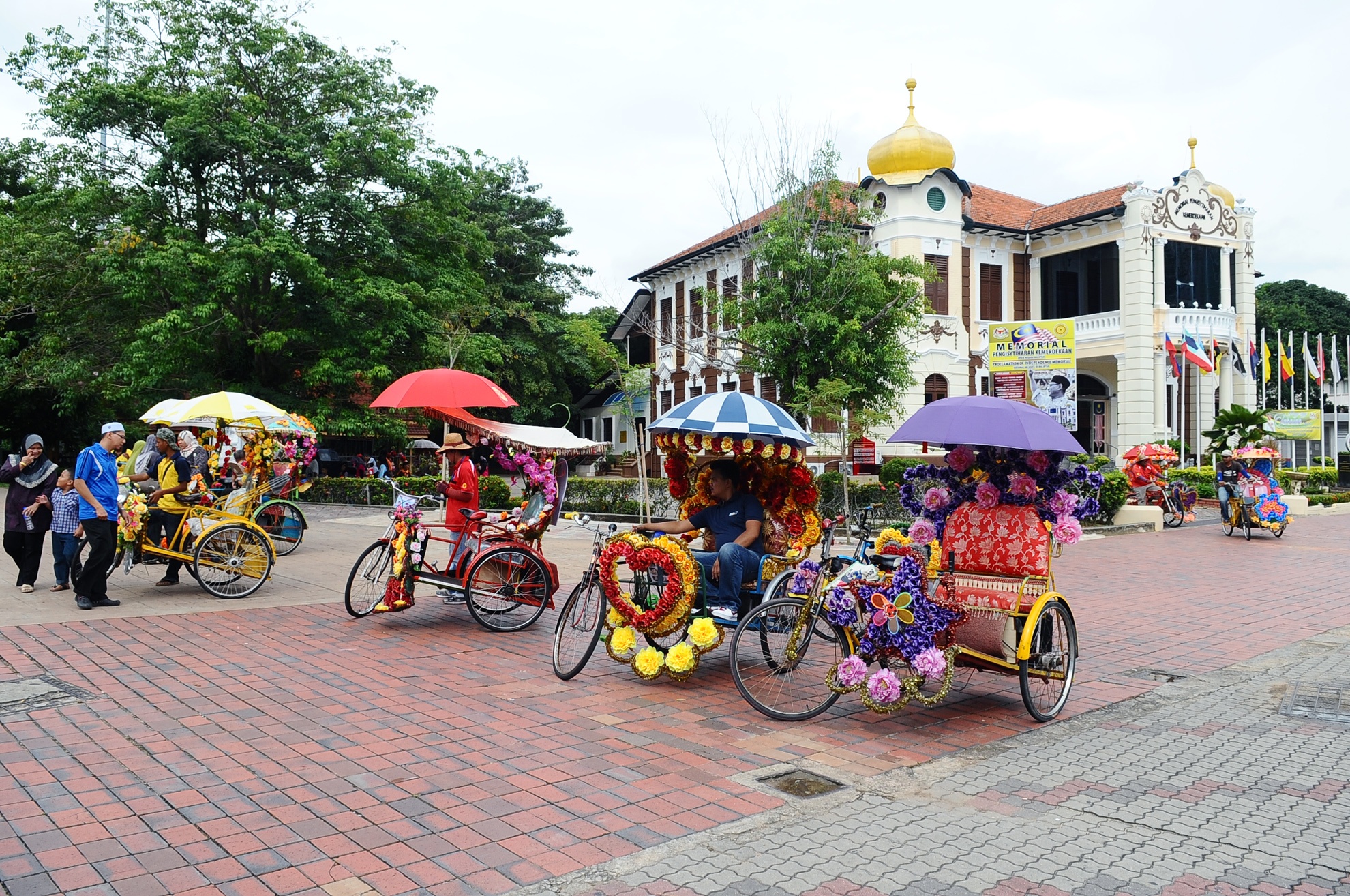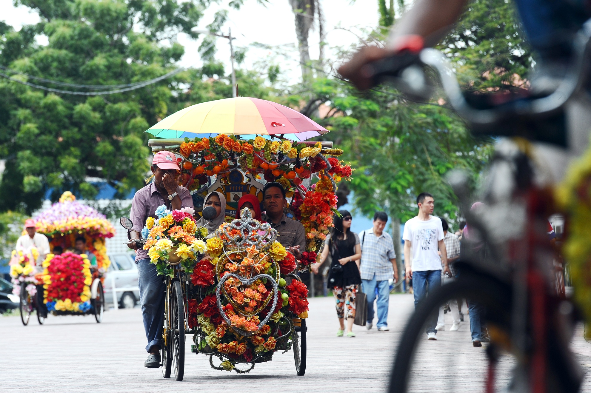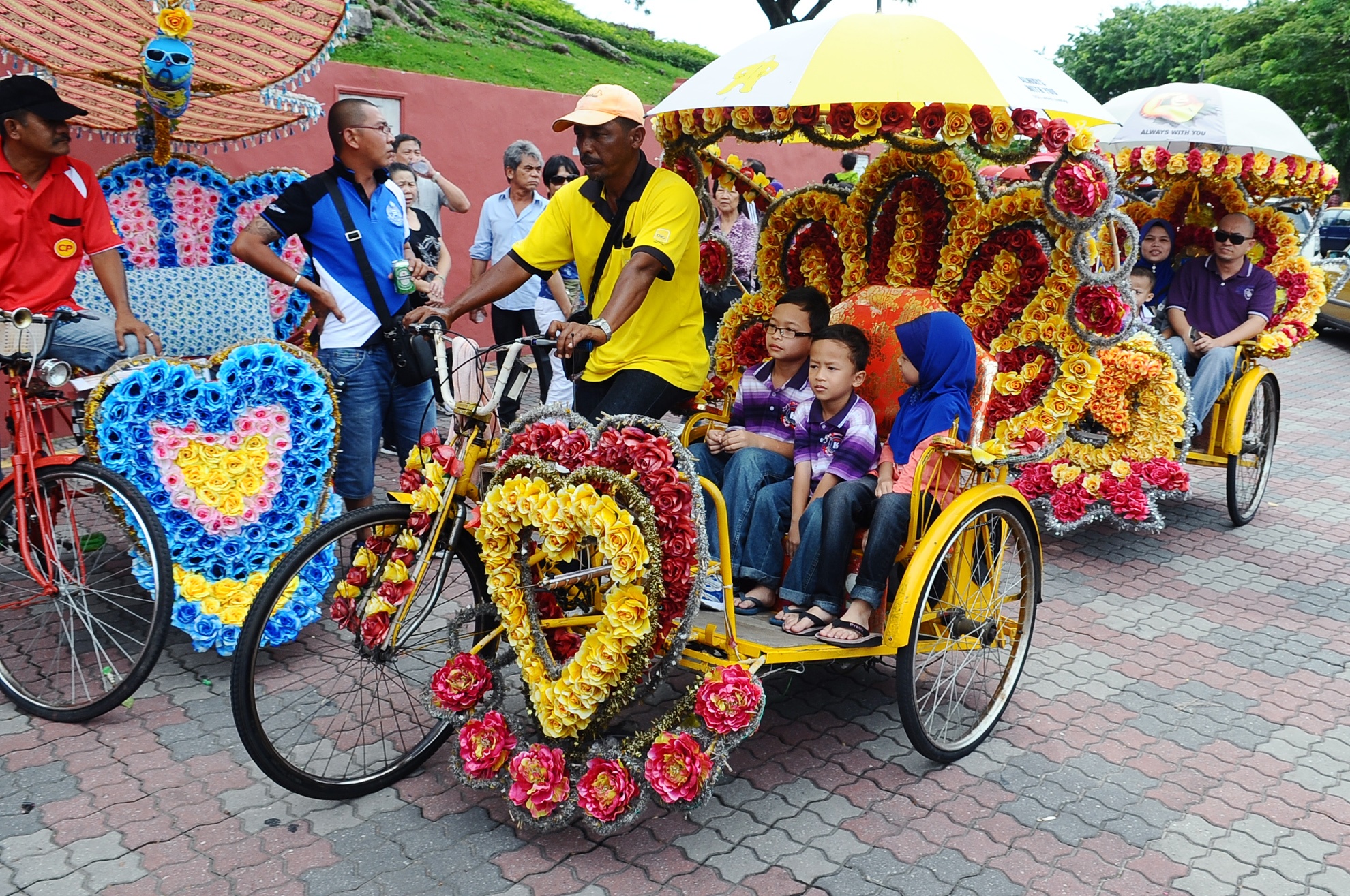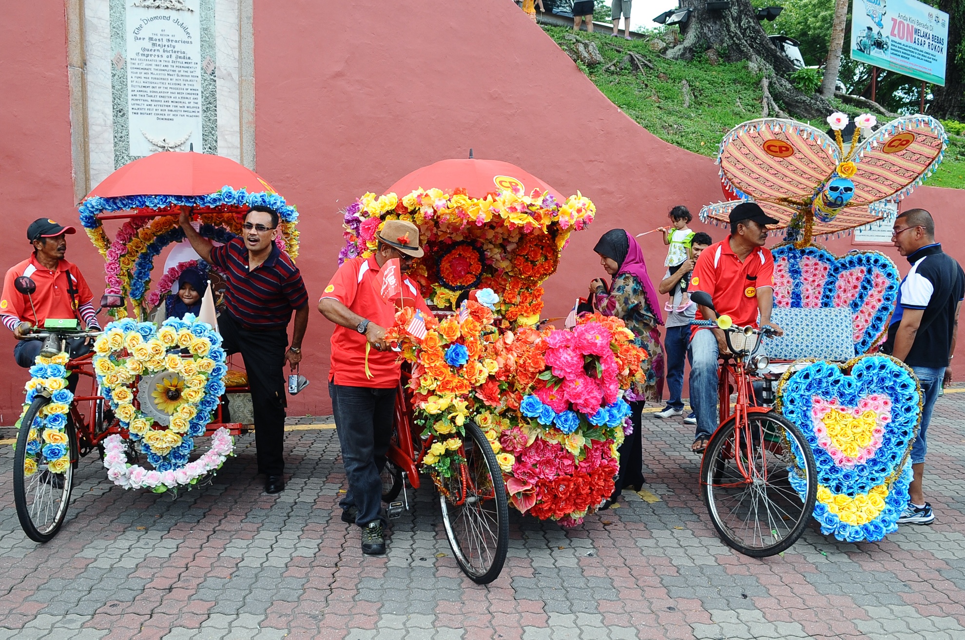 Những chiếc xích lô ba bánh có trang trí hoa nhiều kiểu dáng là phương tiện chở khách du lịch được nhiều người thích thú khi đến Malacca.