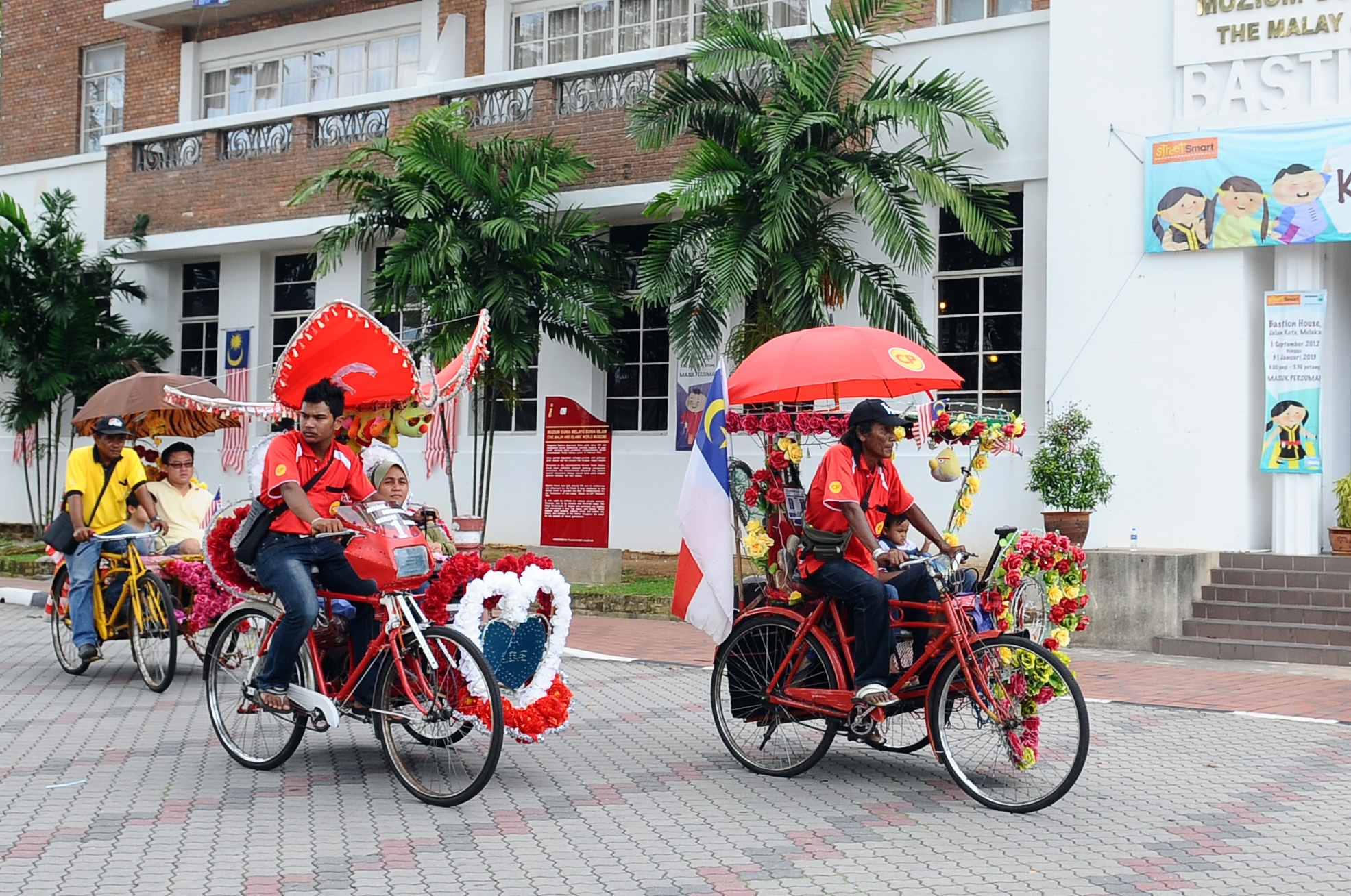 | Nó giống như một chiếc xe đạp có gắn thêm thùng chở bên cạnh. Mỗi một xe được chủ nhân trang trí theo phong cách và sở thích riêng nhưng đều mang ý nghĩa đặc trưng cho nền văn hóa Malaysia nói chung và phố cổ Malacca nói riêng. |
