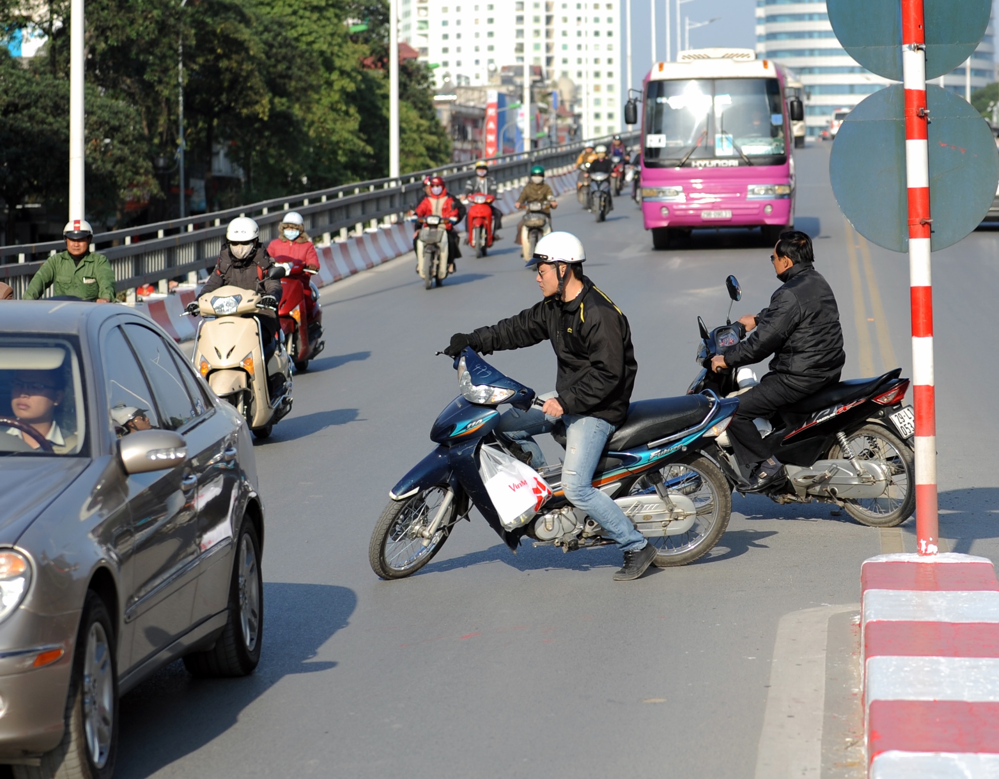 Thay vì đi thêm vài chục mét đến đoạn cua, người đi xe máy ở Hà Nội bẻ cua, đi tắt ngược chiều ngay trước dòng xe cộ đang đổ dốc tại chân cầu vượt.