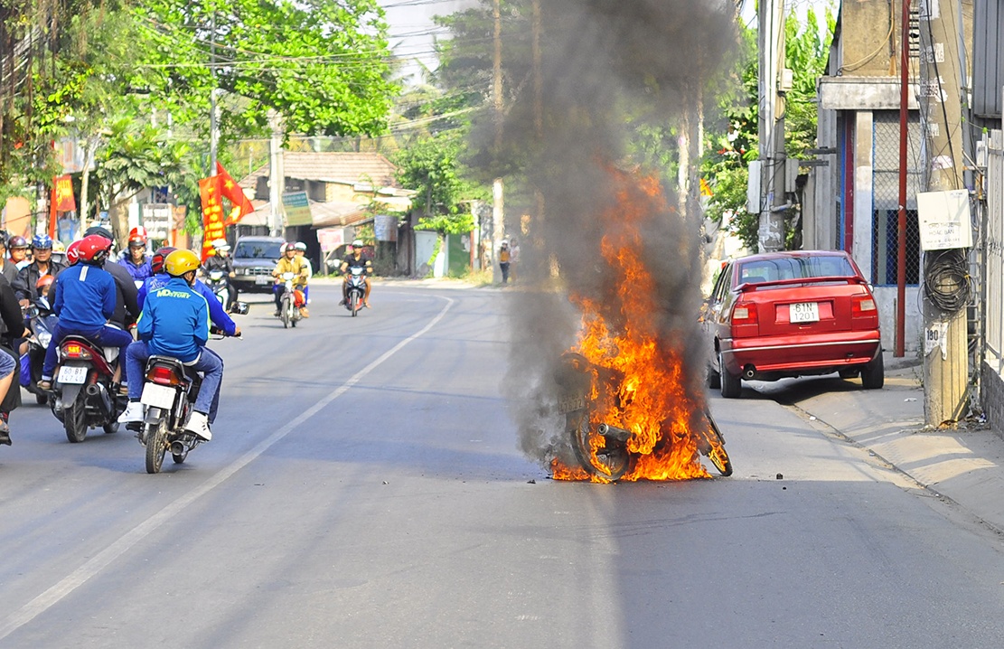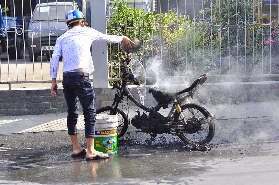 “Lửa bốc lên ngùn ngụt và kèm theo tiếng nổ nên không ai dám đến gần dập. 15 phút sau, các bộ phận bằng nhựa và cao su bị thiêu rụi hoàn toàn”, anh Tân nói.