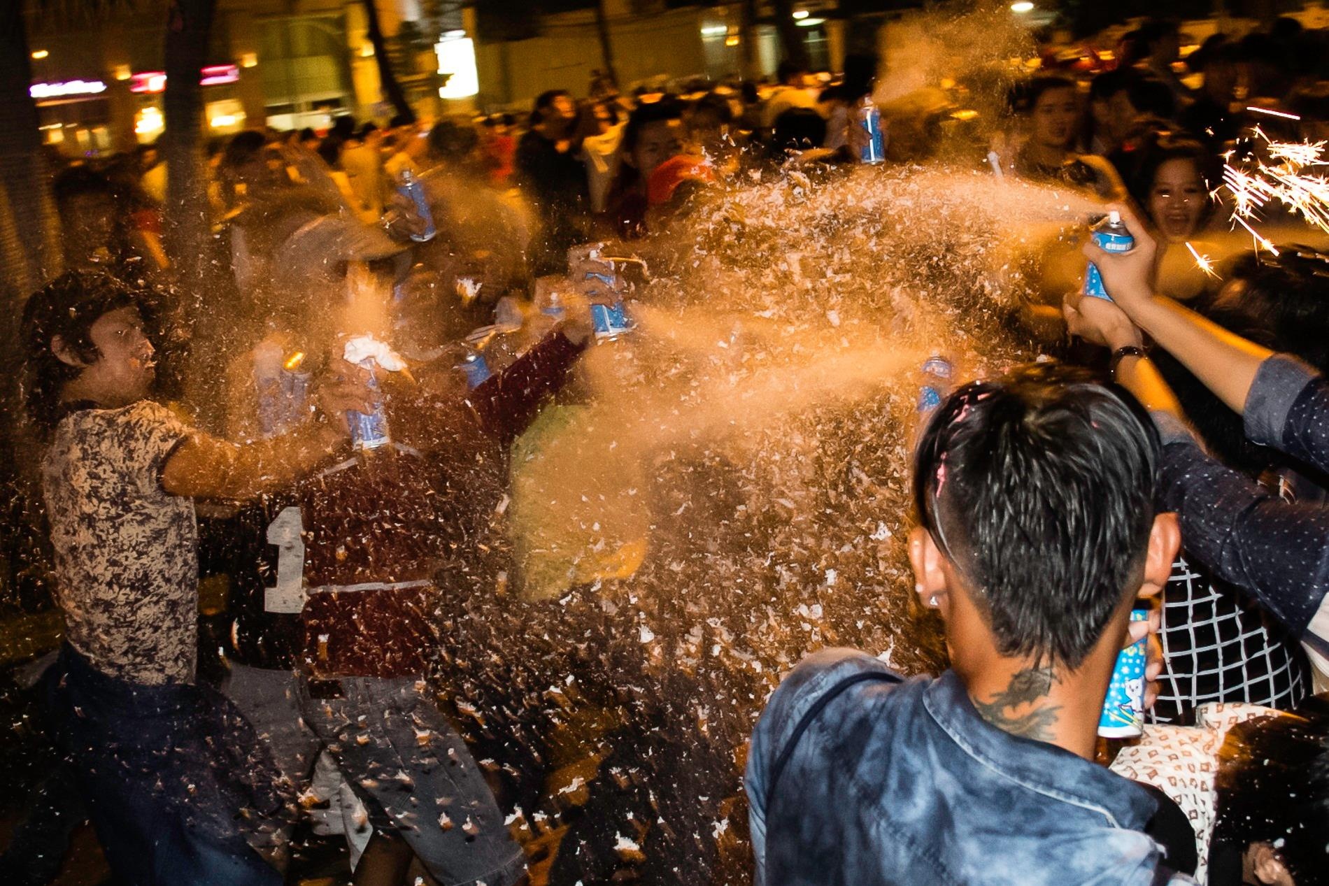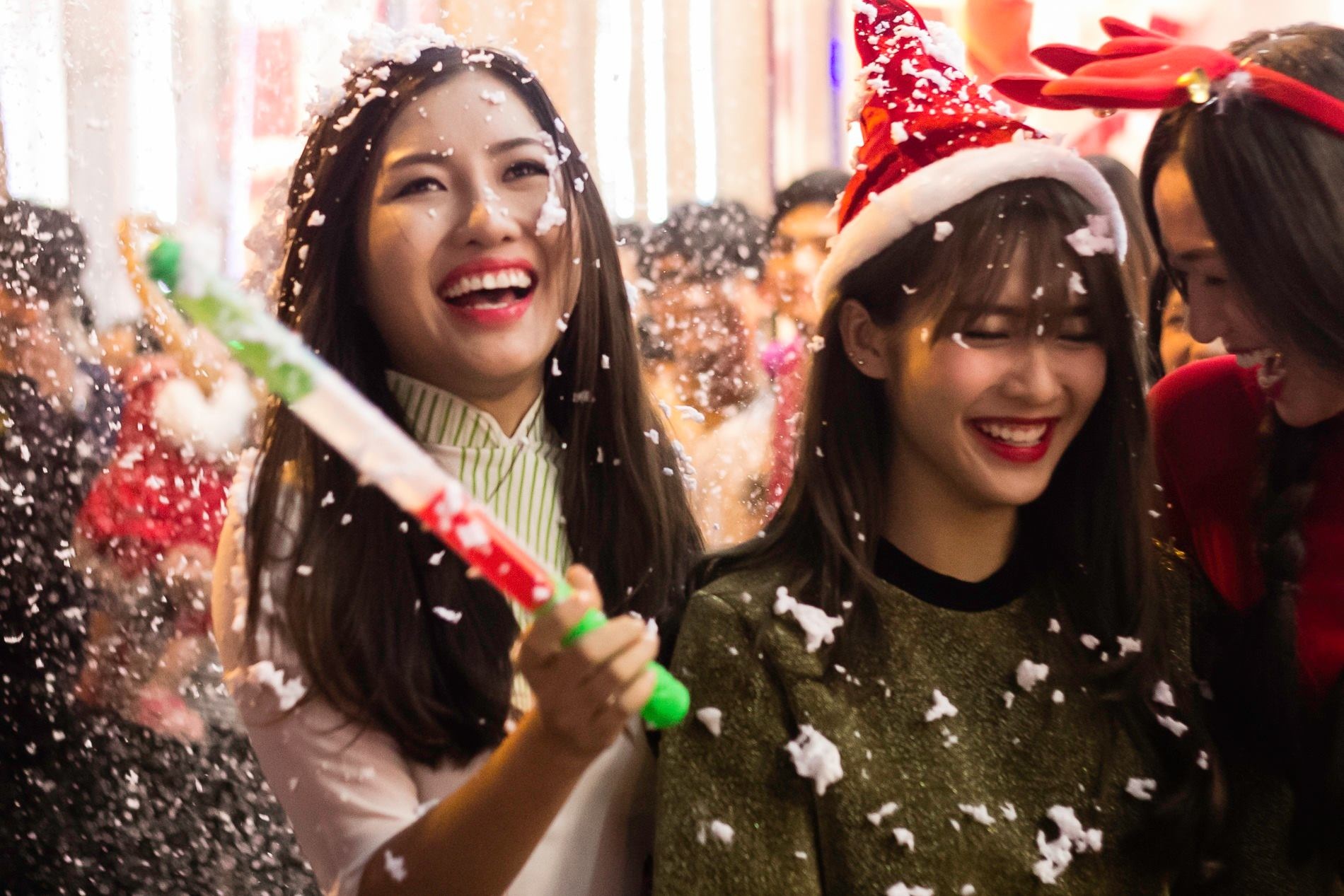 | Trò chơi tung bọt tuyết giả gây thích thú cho các cô gái trẻ. Ảnh: Hải An. |