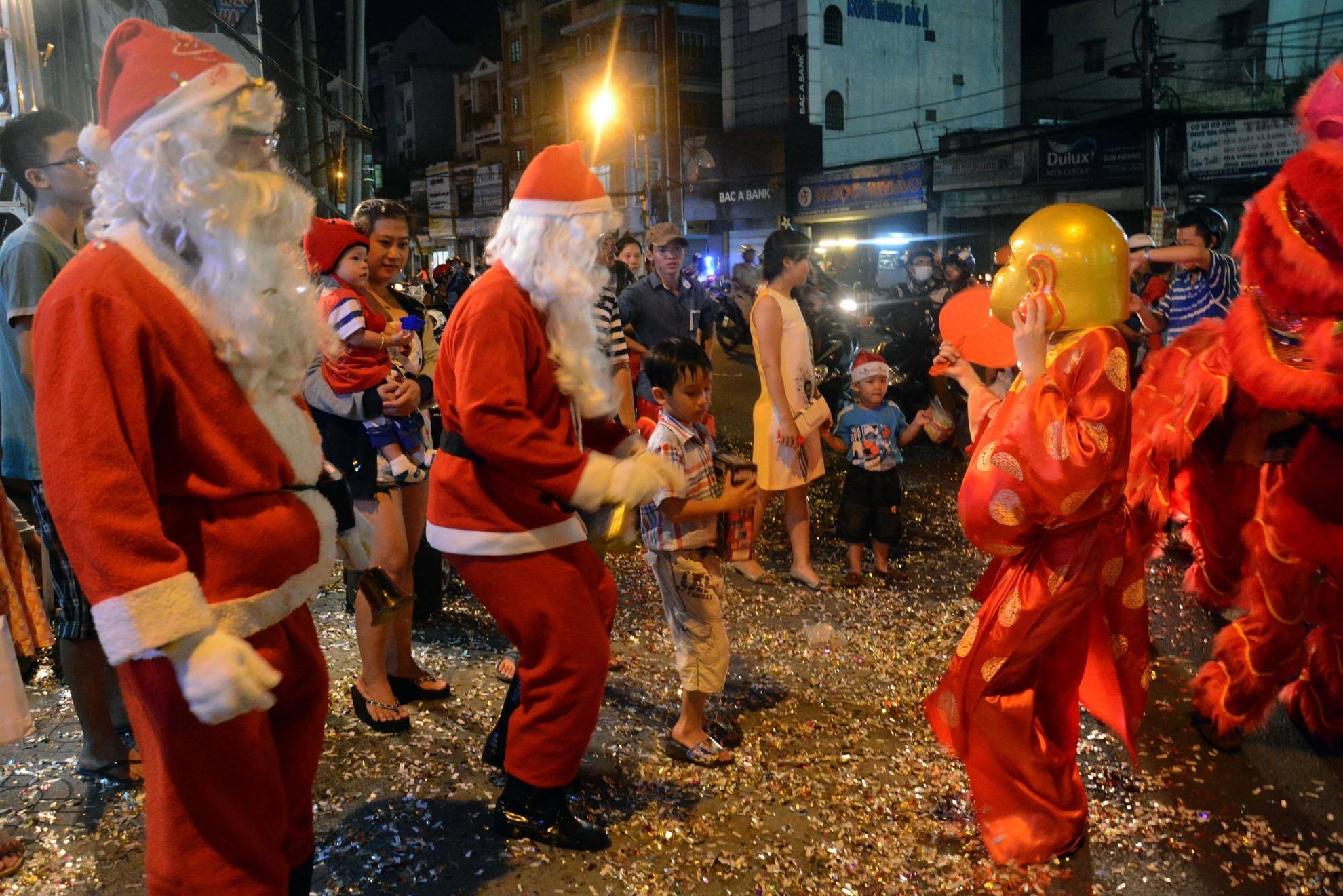 | Các 'ông già Noel' nhảy múa tưng bừng cùng trẻ em. Ảnh: Lê Quân. |
