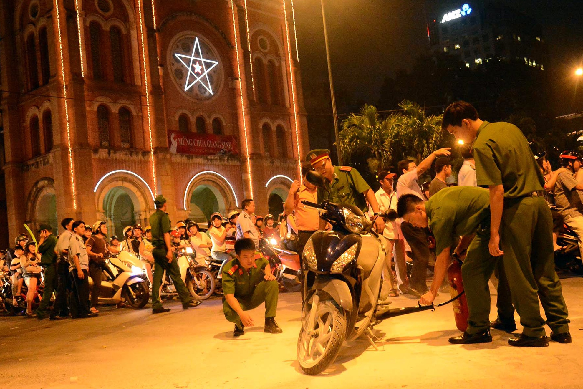 | Sự việc này xảy ra ngay trước cửa nhà thờ Đức Bà khi hàng nghìn người đang đổ về trung tâm quận 1 đón Noel. Rất may chiếc Honda Vision không bị thiệt hại nhiều, cảnh sát đã cho lên ô tô chở đi ngay lúc đó, còn người chủ xe thì bị dang dở cuộc vui. Ảnh: Minh Thanh. |