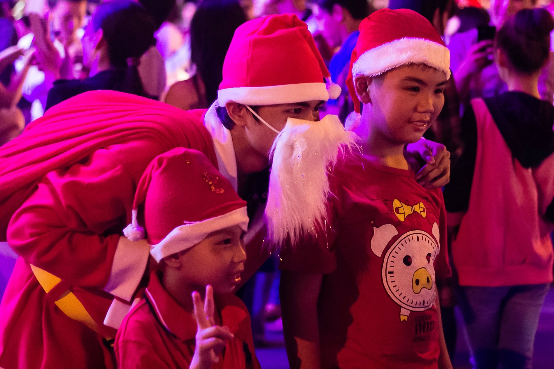 | Trẻ em thích thú các 'ông già Noel' với bộ râu trắng. Ảnh: Hải An. |