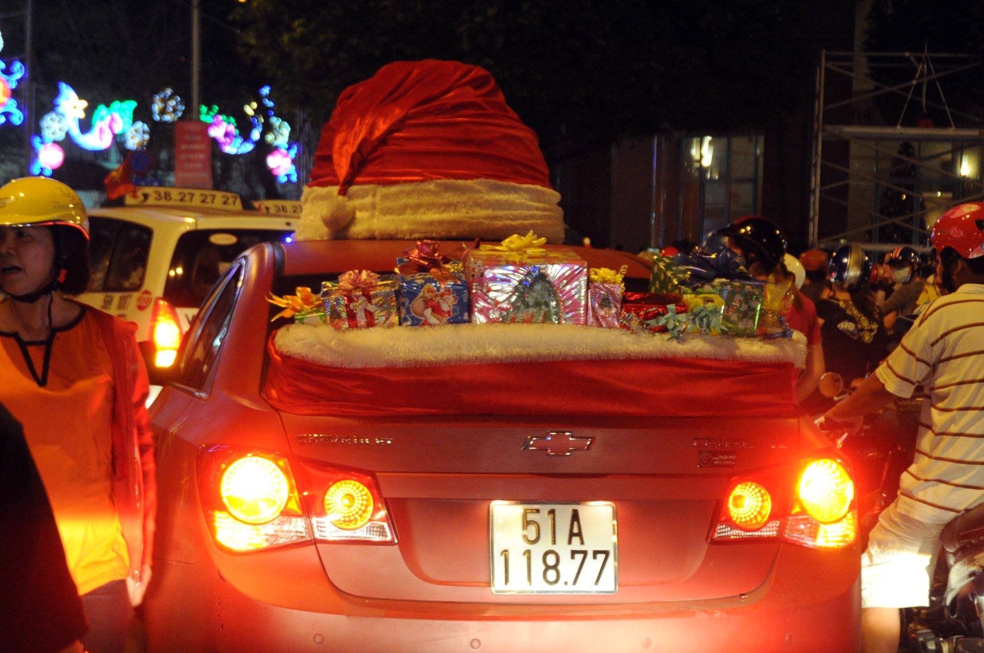 | Một nhóm thanh niên mang hẳn ô tô ra đường bày quà đi dạo phố. Ảnh: Nguyễn Quang. |