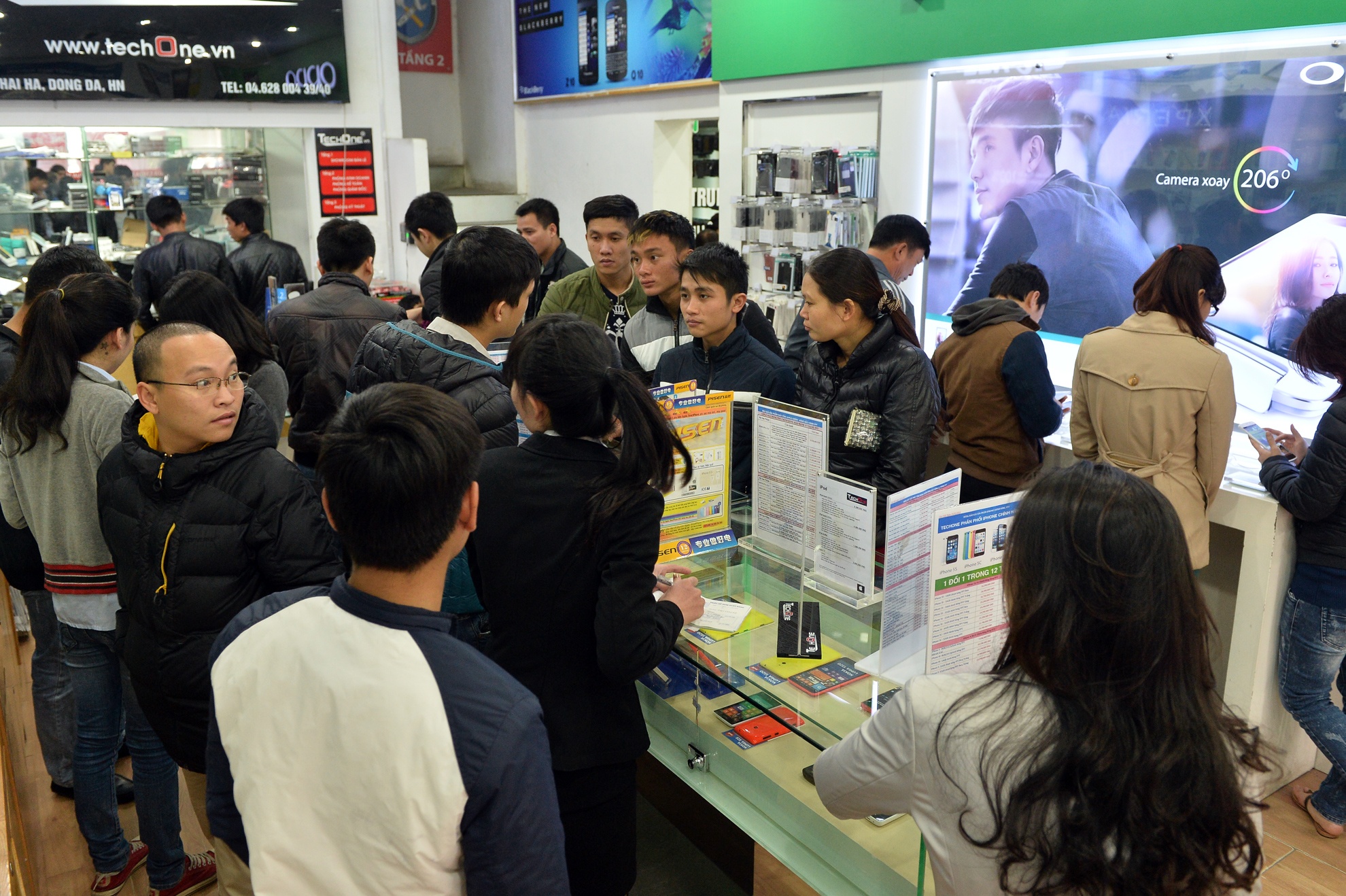 | Một số cửa hàng điện thoại di động, máy tính bảng cũng trong tình trạng tương tự. Khách đến mua rồi đứng chờ cài đặt mất vài chục phút khiến nơi này không còn lối đi. |