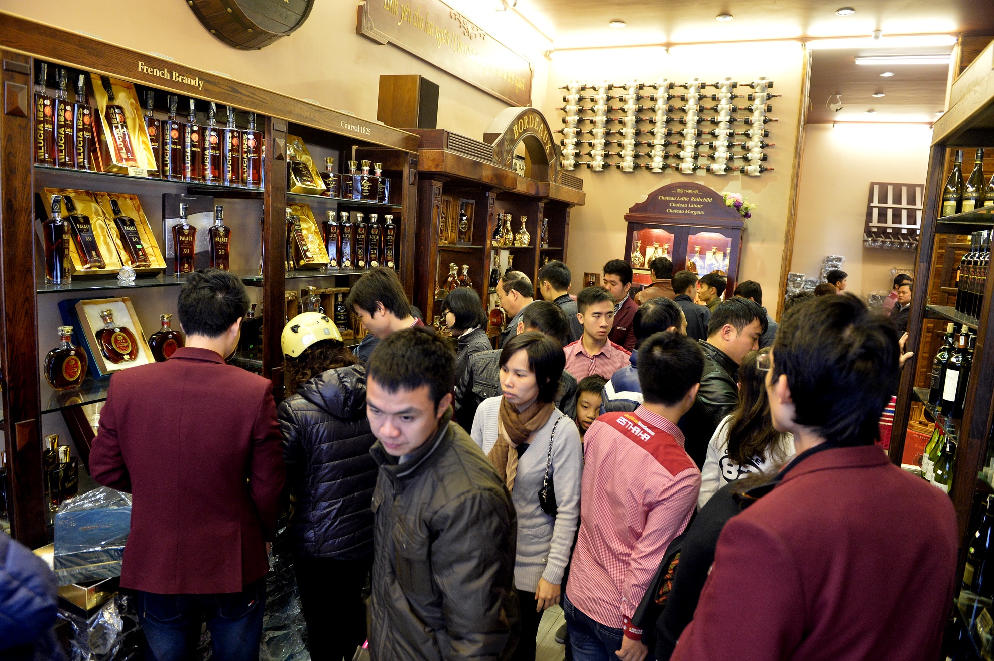 | Một showroom bán rượu vang ngoại nhập cùng nhiều mặt hàng Tết trên phố Thái Hà. |