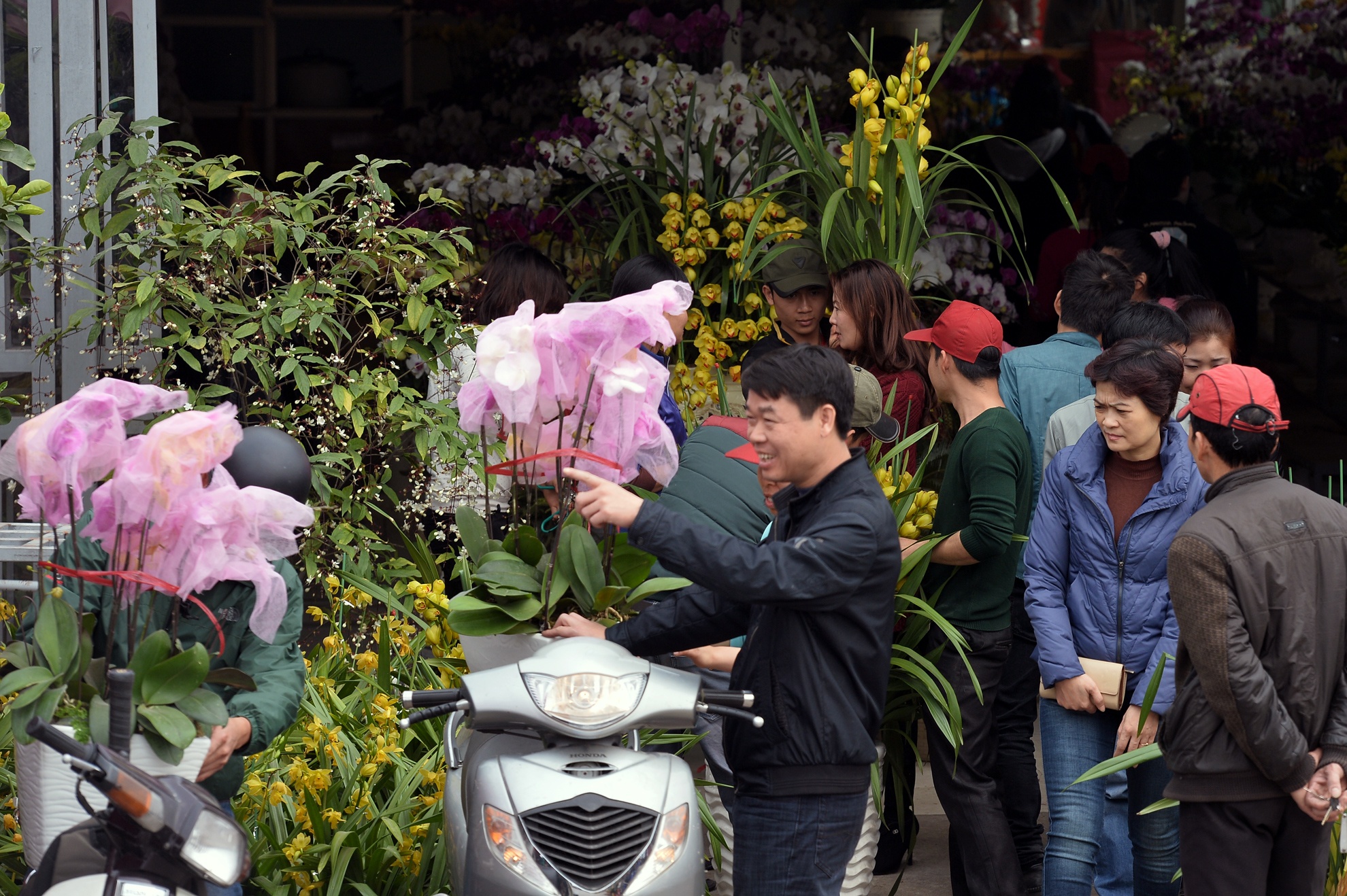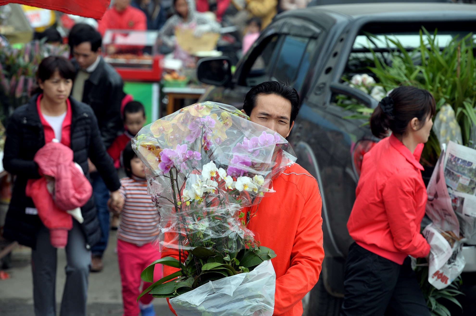 | Anh Dương (áo đỏ) bê chậu lan hồ điệp vừa mua được với giá 2.050.000 đồng. |