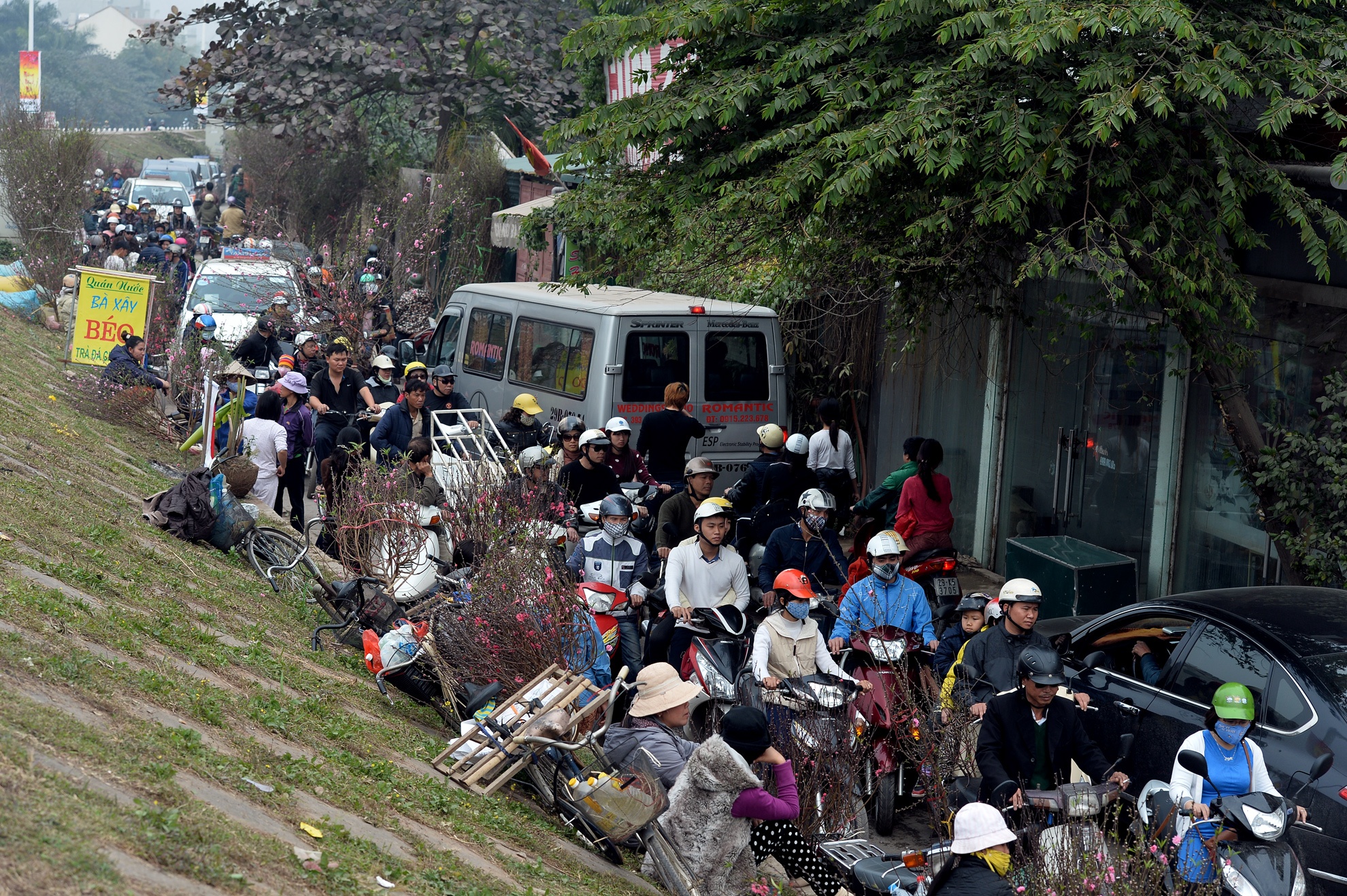 | Ngày chủ nhật cuối cùng của năm Quý Tỵ, đường Âu Cơ nơi dẫn đến các chợ hoa đông nghẹt cả hai bên triền đê. |