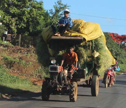 | Có khi là cỗ công nông lừng lững, đi loạng quạng, người ngồi chỏm chòe trên nóc xe như đang hớn hở chơi với… Diêm Vương. |