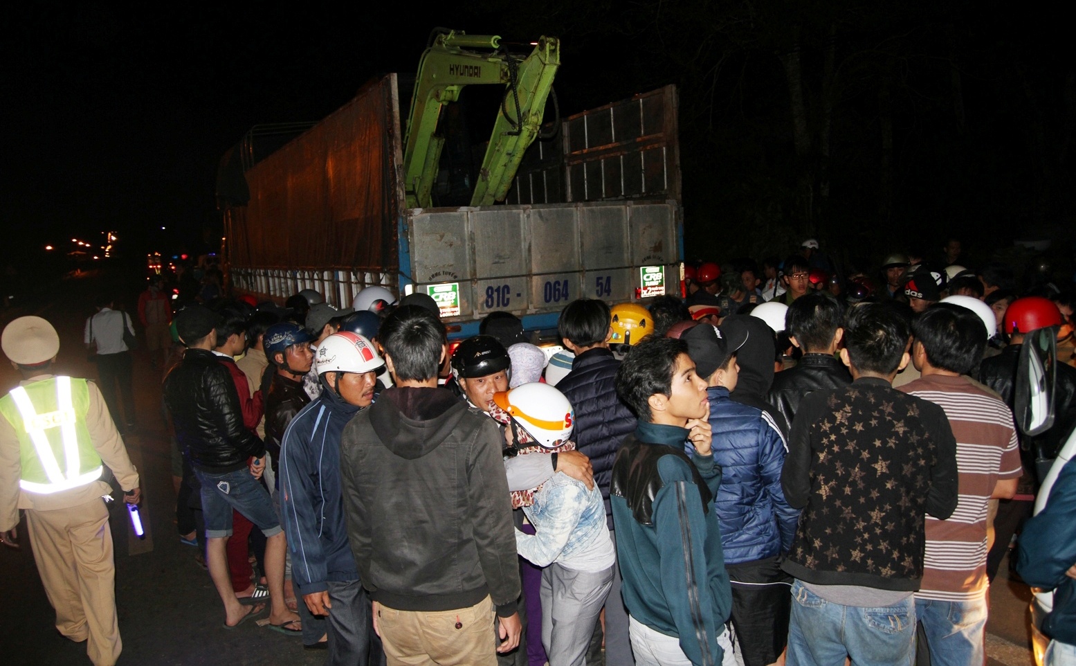 Tại hiện trường, đầu xe máy của anh Long dính vào bánh sau ôtô tải và biến dạng. Hàng trăm người dân đến hiện trường theo dõi vụ việc khiến giao thông trên đường Hồ Chí Minh ùn tắc nghiêm trọng.