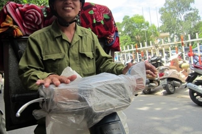 | Chiếc xe máy này được bọc miếng nilon để tránh nước mưa làm chập hệ thống điện. |