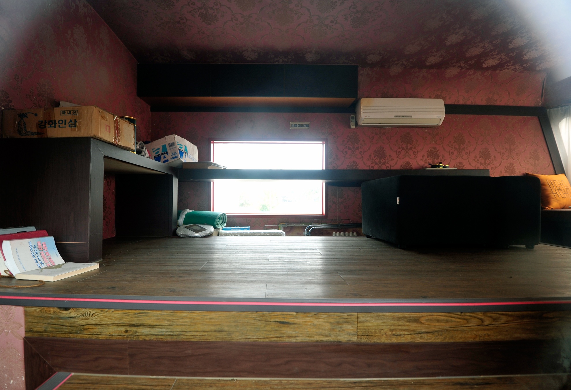 Quan sát từ cửa sổ kính nhìn vào bên trong, nội thất gỗ và các chi tiết còn khá tốt. Một vài thùng carton chữ Hàn Quốc và sách về luật Kế Toán còn khá mới nằm trong xe.