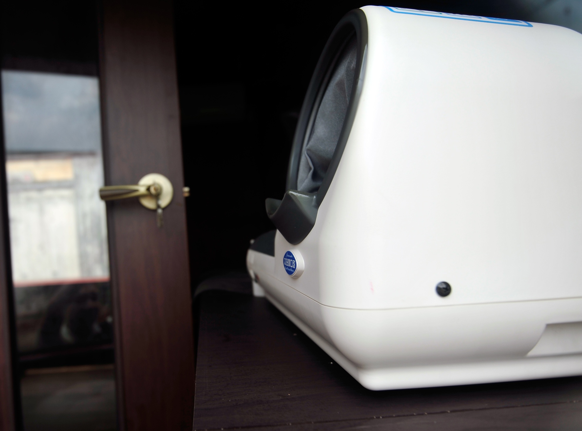 Một thiết bị phục vụ công tác khám chữa bệnh trên xe bằng tiếng Hàn Quốc nằm ngay gần cửa sổ cabin chữa bệnh.