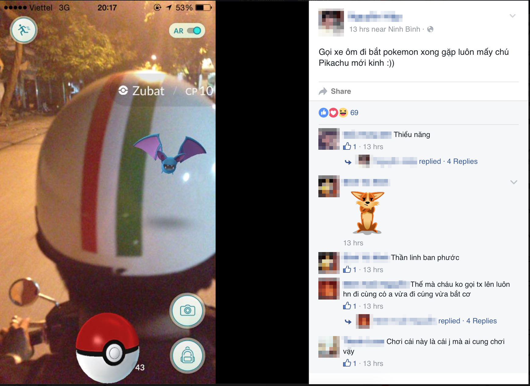 | Một người chơi đi xe ôm bắt pokemon chia sẻ trên trang cá nhân. |