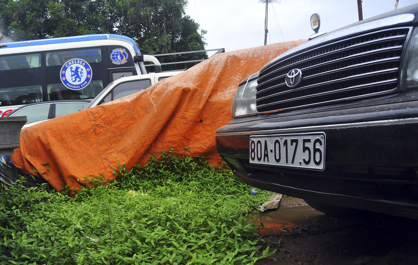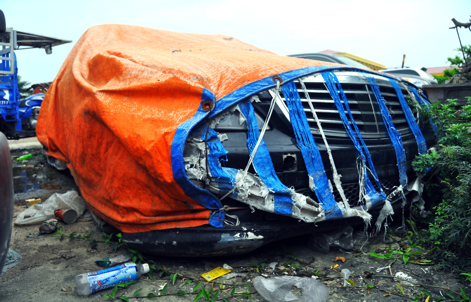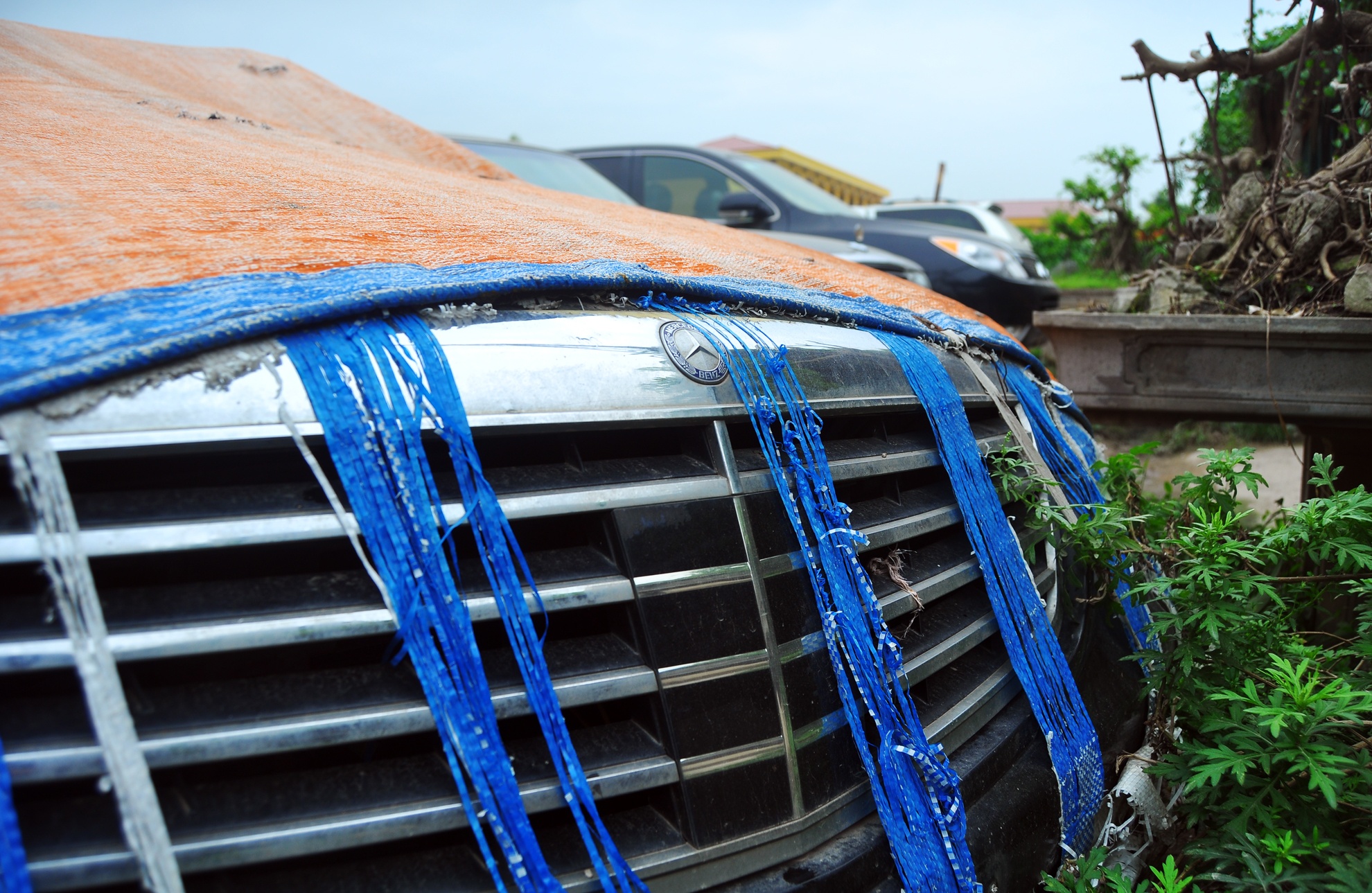 | Sau nhiều năm, cỏ mọc um tùm bên chiếc Mercedes. Bạt phủ mục nát theo thời gian. |