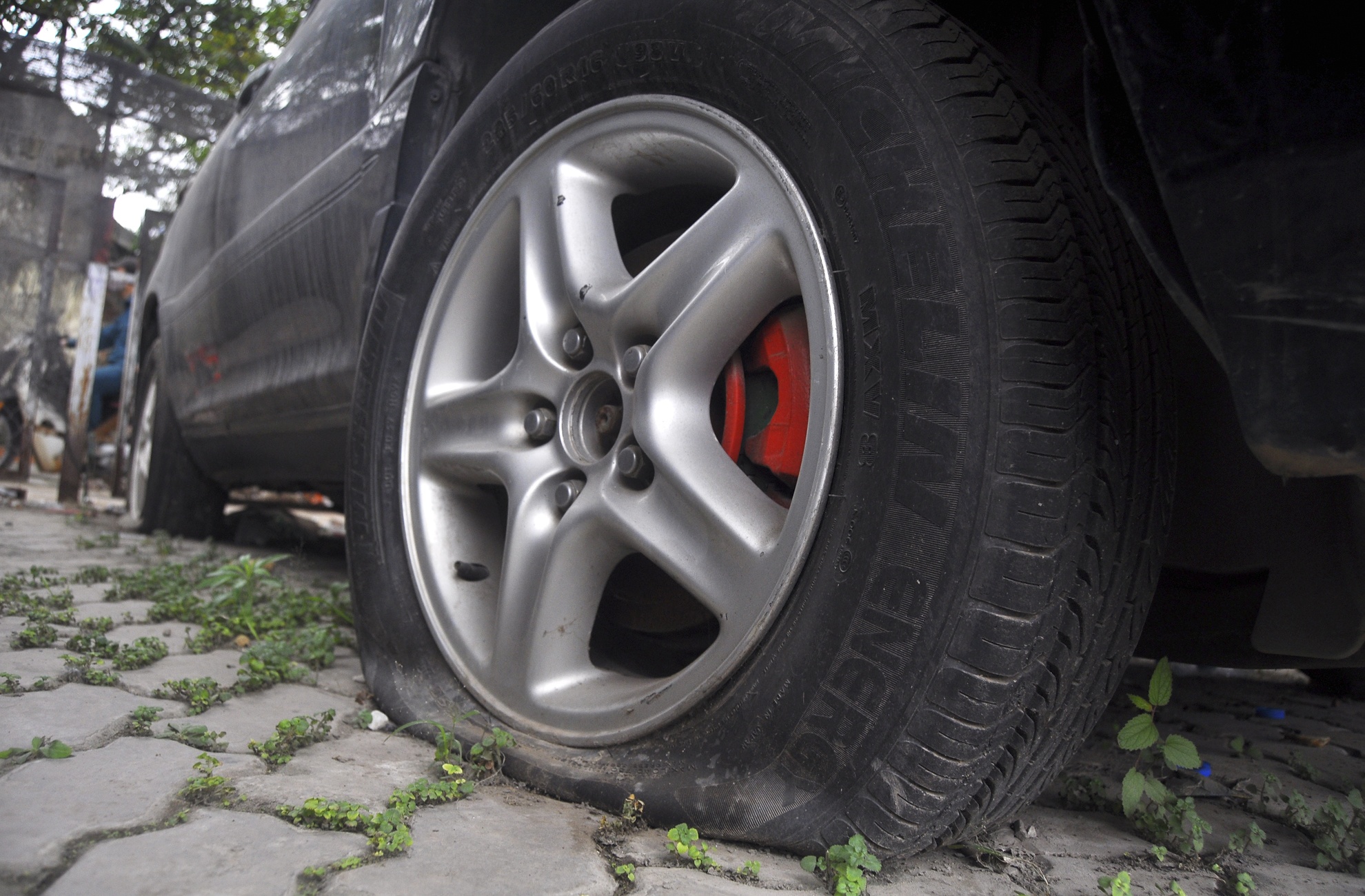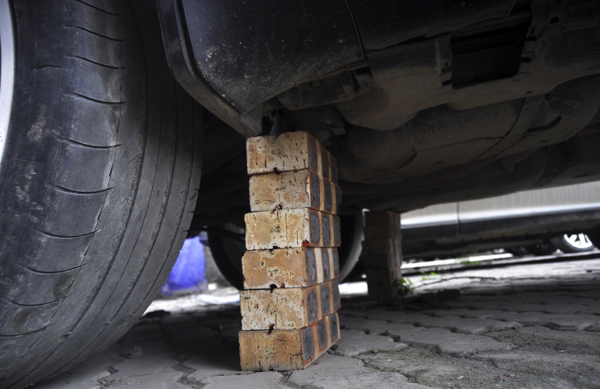 | Người này còn kê gạch phía dưới gầm để chống hỏng vành, lốp và bộ giảm xóc. |