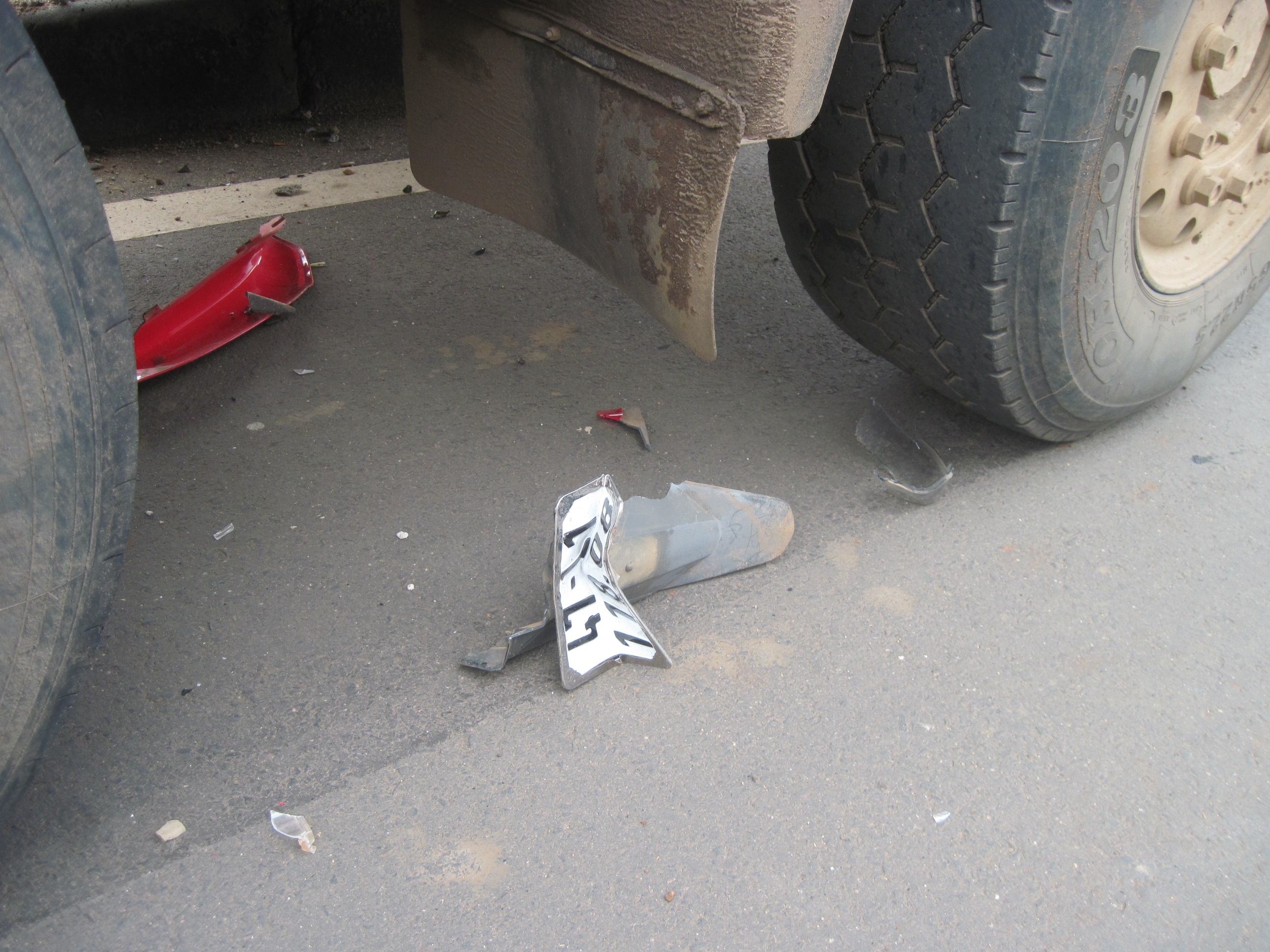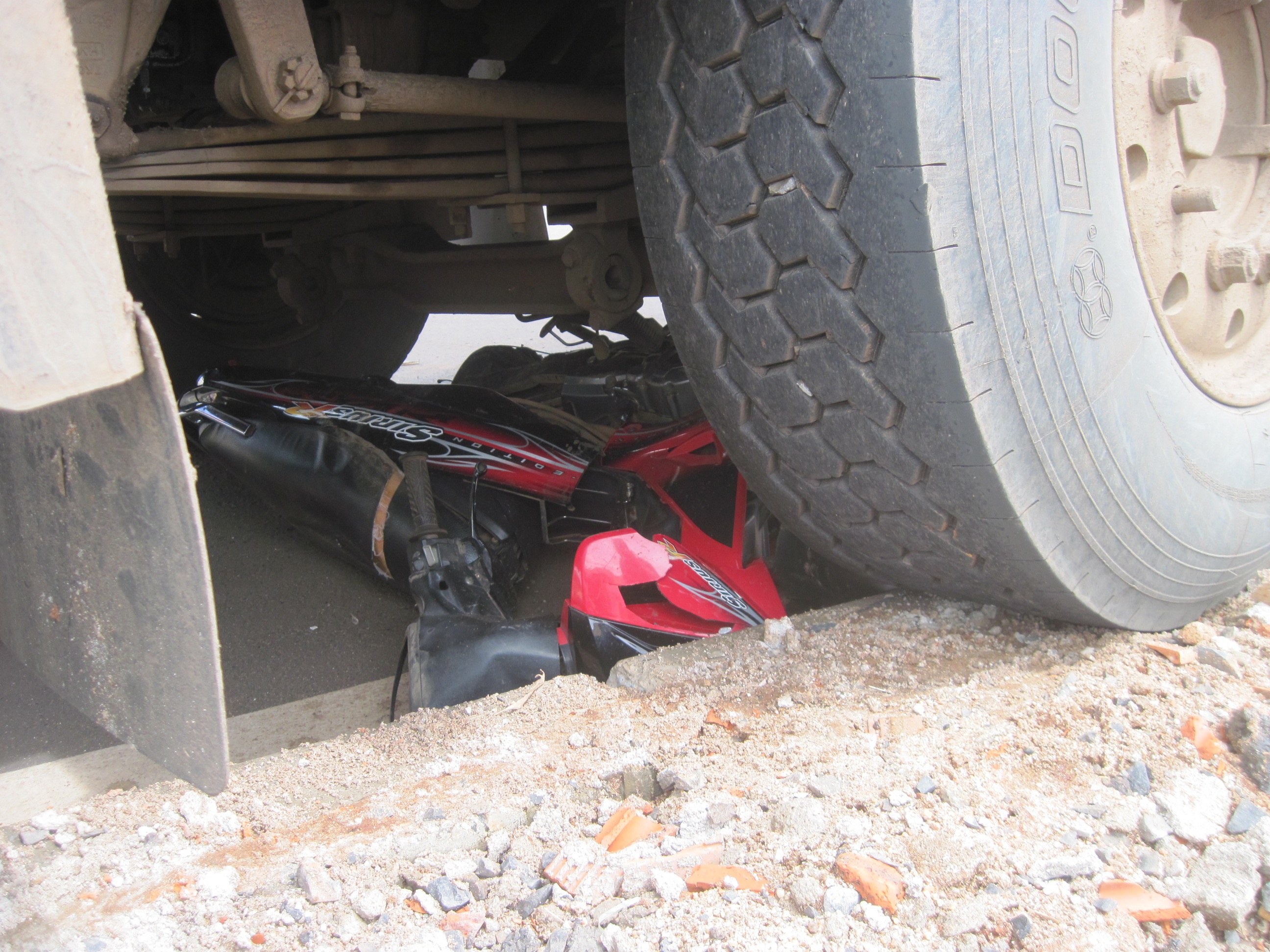 | Bánh sau của xe tải đè vào bánh trước xe máy bẹp dúm, toàn bộ chiếc xe máy bị cuốn vào gầm xe tải. |