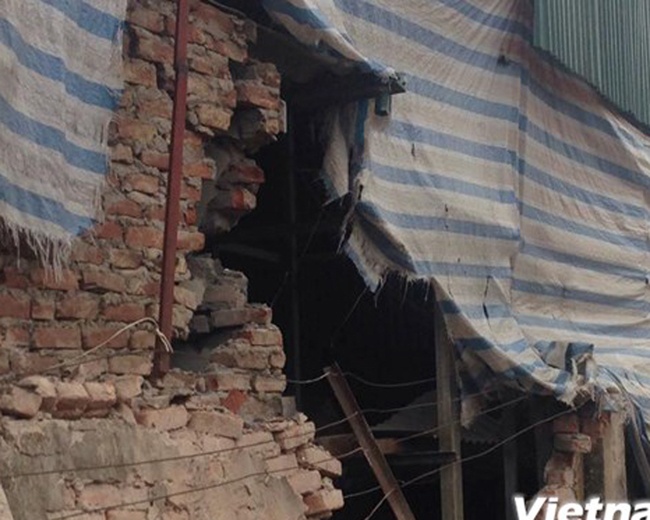 "Hoảng hốt, chúng tôi chạy ra thì thấy bức tường ngăn giữa nhà và công trường bên cạnh đã thủng một lỗ lớn và nứt ngang dọc," một nhân chứng cho hay.