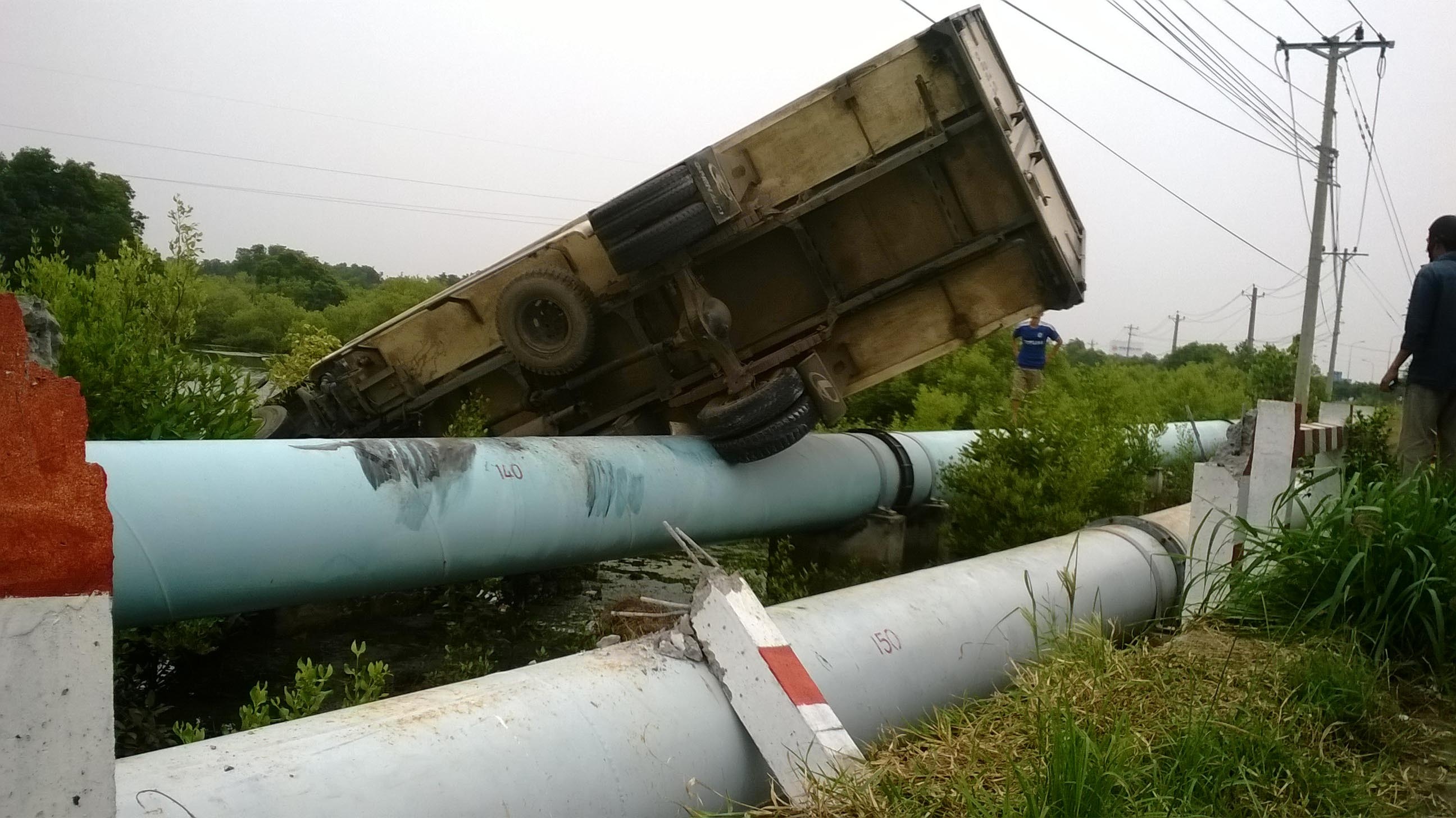 | Chiếc xe chỉ dừng lại khi một bên bánh sau bị đường dẫn nước cản lại. |