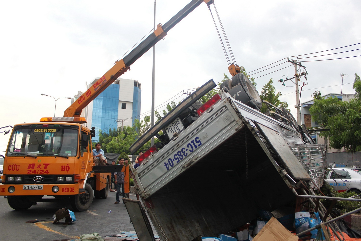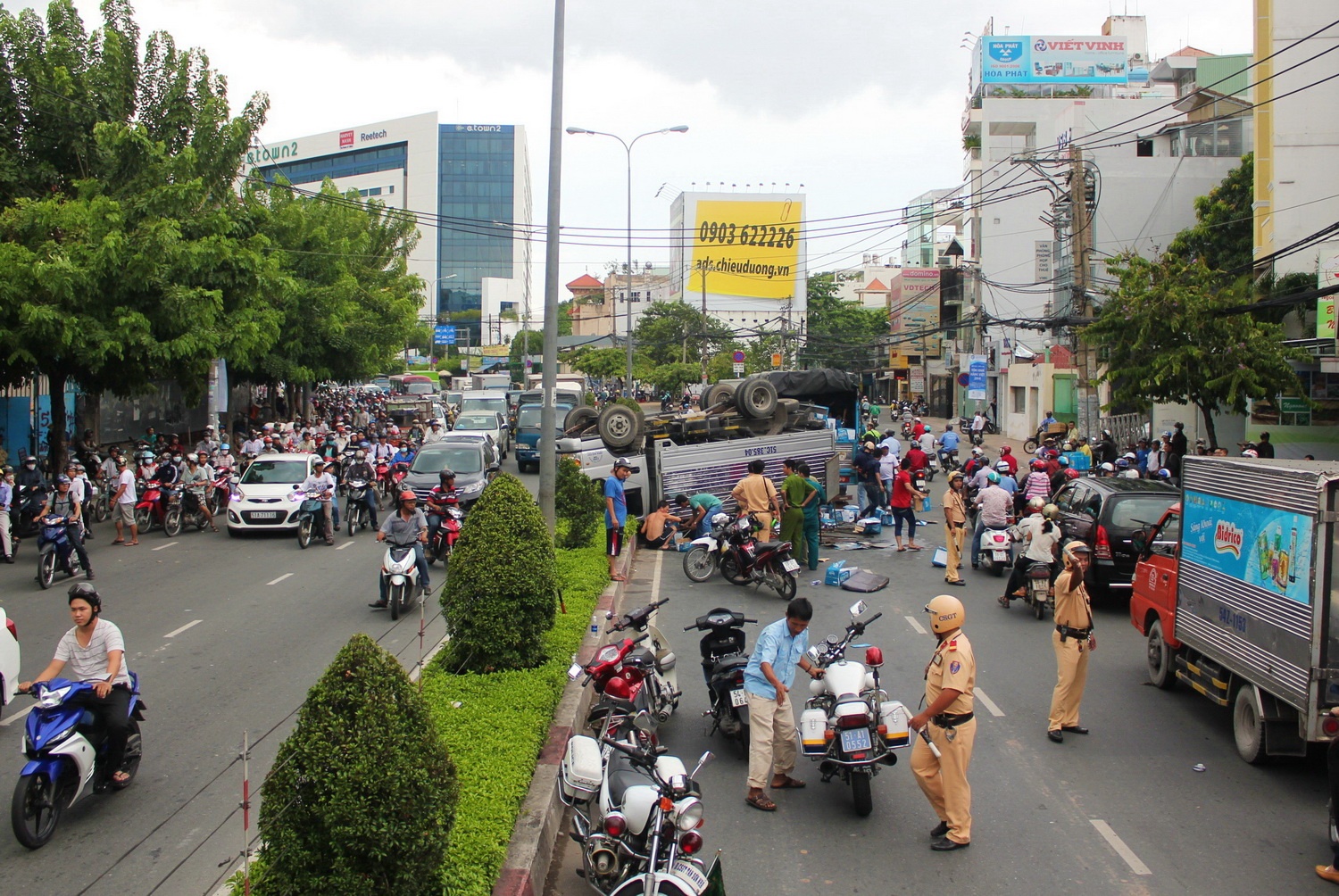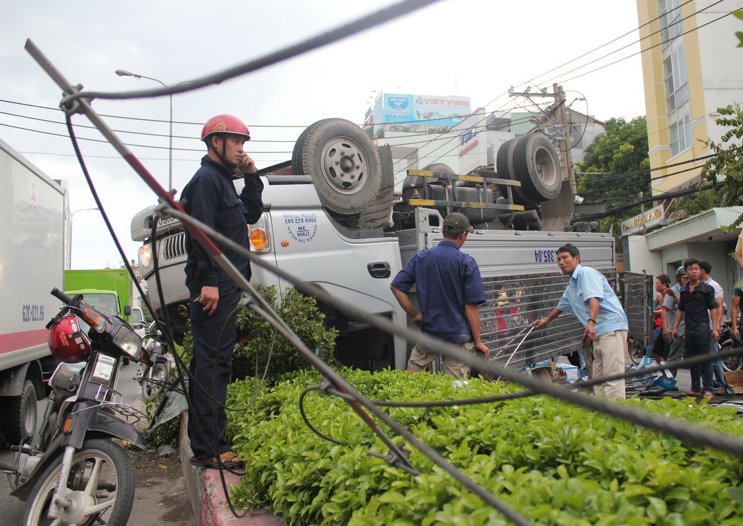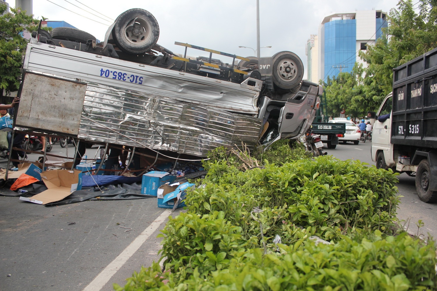 | Khi ôm cua đoạn qua tòa nhà Etown 2 thì xe bất ngờ bị nổ lốp, tài xế mất lái nên xe tải lao qua dải phân cách rồi lật ngửa phía trái đường. Sự cố xảy ra làm tài xế và phụ xe mắc kẹt trong cabin, người dân chạy đến đưa ra ngoài cấp cứu trong tình trạng bị thương khá nặng. |