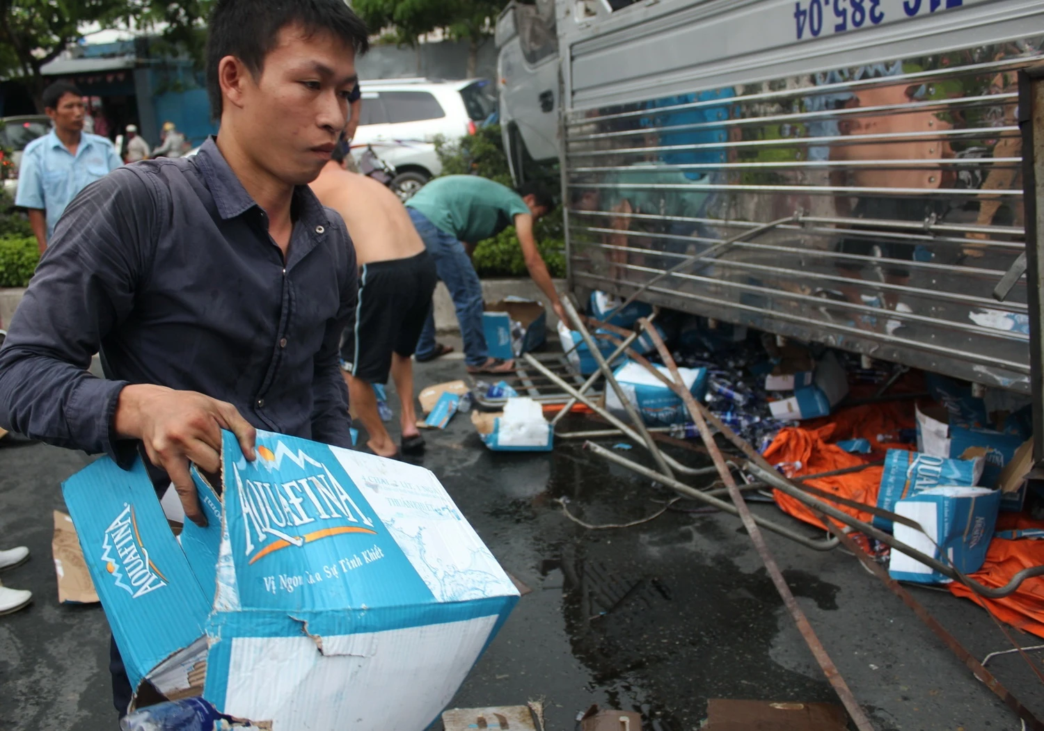 | Gần 100 thùng nước khoáng bị rơi khắp nơi nhưng không có ai lợi dụng tình hình để "hôi của". |