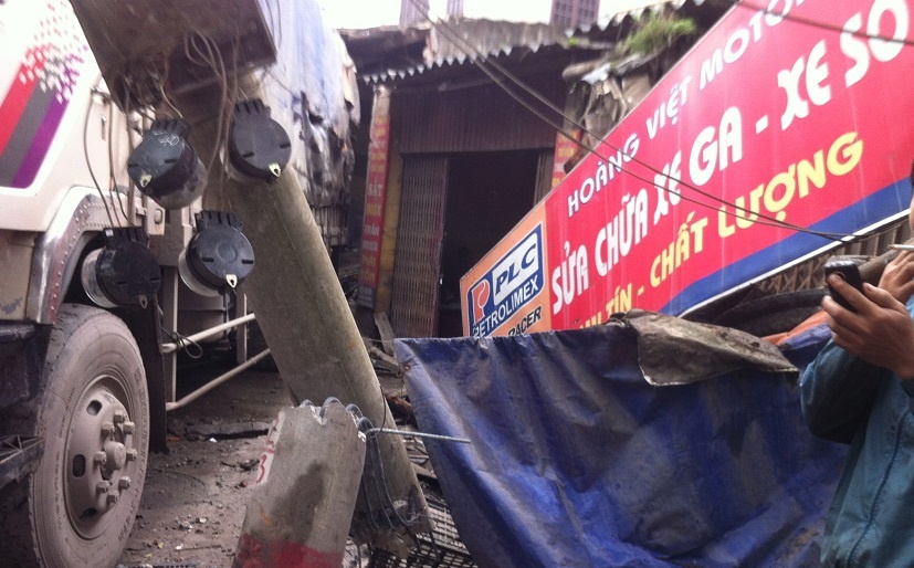 Chưa dừng lại ở đó, chiếc xe còn lao thẳng vào cửa hàng của những hộ dân dưới chân dốc. Hậu quả, một chiếc cột điện bị xe tải tông gãy, 3 nhà dân bị hư hại, một nhà dân bị húc đổ tường.
