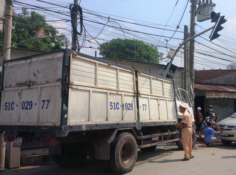 Ngay lúc này, xe tải đâm trực diện vào xe du lịch 7 chỗ ngồi biển số 60M do ông Nguyễn Văn Thanh (54 tuổi, ngụ Đồng Nai) điều khiển. Cú va chạm khiến xe du lịch bị đẩy ra xa, xe tải tiếp tục lao vào lề đường đâm gãy cột đèn giao thông.